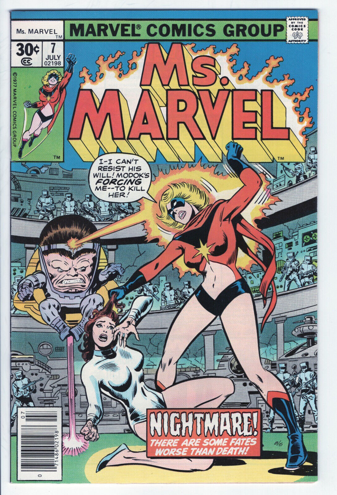 MS. MARVEL #7 - 7.0 - OW-W - Versus ModokDESCRIPTION:This very sharp unrestored copy is complete, fully readable and has both covers attached. The book has very high cover gloss, a very tight spine and off white to white pages. This book features Ms. Marvel versus Modok. The book is sent in a mylar sleeve with a backing board. Condition is a very conservatively graded 7.0, FN-VFN.SHIPPING INFORMATION:Combine our auctions and $ave on shipping!Please remember that Media Rate may take up to 4 weeks delivery.FEDEX services available.Nevada residents, please add sales tax.We accept PayPal, MasterCard, Visa, Discover, American Express.NOTES AND FINE PRINT: Welcome to Redbeard's Book Den! For most that have collected comic books for the last 30 years, you have probably heard of us. Redbeard's founder and current owner is Ron Pussell (aka Redbeard), senior Overstreet Price Guide consultant since 1980.REDBEARD'S BOOK DENPO Box 217Crystal Bay, NV 89402-0217 _gsrx_vers_1503 (GS 9.2.1 (1503))