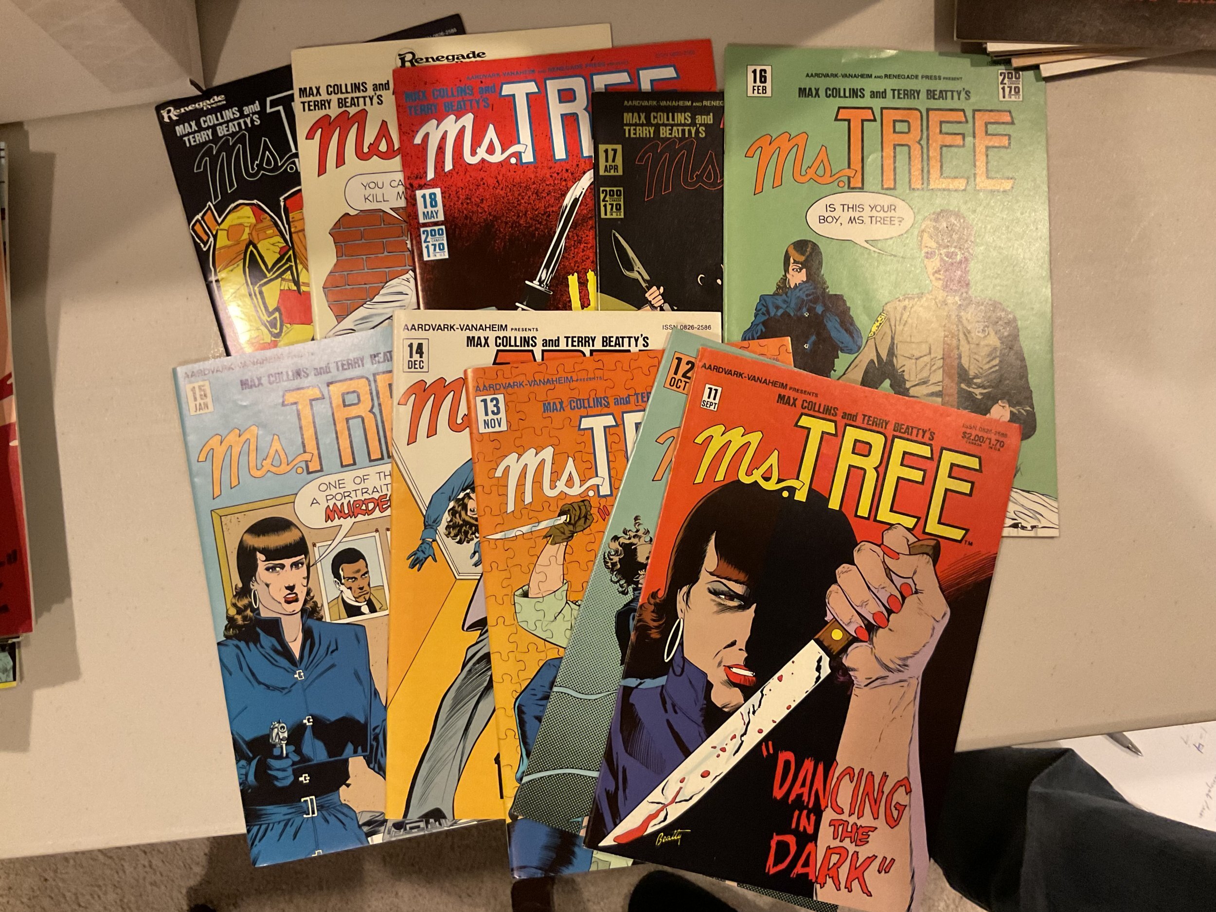 This set includes all 50 issues published by Eclipse, Aardvark/Vanehiem, and Renegade Press from 1983-1989. Also includes the 3D special - with original glasses and the Ms. Tree Rock and Roll Special. 52 books in all. Frank Miller double page pinups in issues 1-4 and Mike Grell in 6-7. Great run of comics by Max Alan Collins and Terry Beatty.This set does not come individually bagged and boarded but all issues should average out to about a F condition or better.