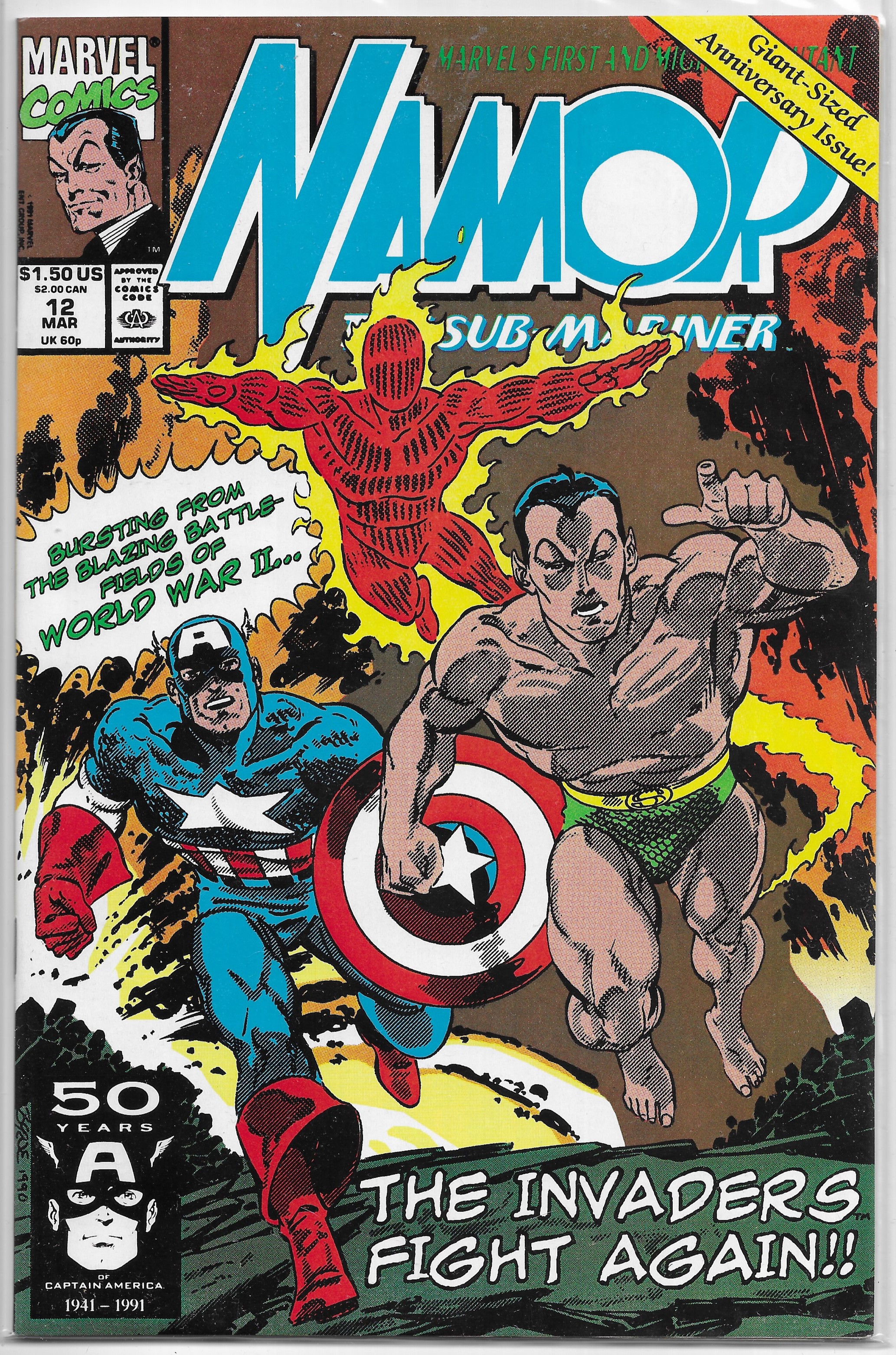 synopsis: Captain America, Namorita, Spitfire, and a new Union Jack unite to save the original Human Torch from Master Man & Warrior Woman!