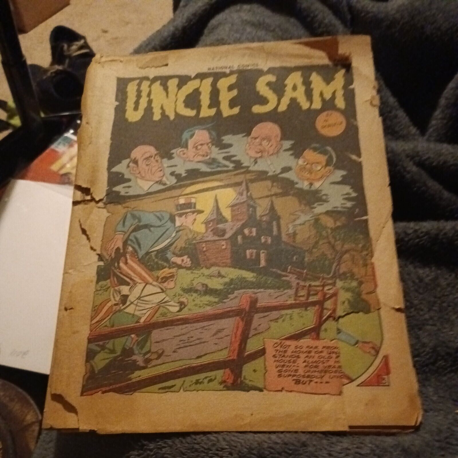 Grade: 0.5 PoorNational Comics #29 Quality Comics 1943 Golden Age Superhero Origin the unknown. Sadly it grades low as it has bends tears water damage it is missing the cover the first wrap has the spine split all the way down and pieces missing of the last and first page which take out some word bubbles half of the centerfold has been torn out and the center fold is detached as a result the first and last story are unreadable as well as the middle one (but all the other interior pages and stories are complete) and other defects. I would call it around a 0.5 pr out of 10 condition. See pics and judge for yourself before purchasing as grading is subjective. While we accept returns we do not accept returns for defects that are listed in the description or clearly visible in the pictures regardless of how big or small they are. It is your responsibility as a customer to review any information or pictures given before purchase. The grading is only our opinion and we are not responsible if you choose to have it professionally graded after it leaves our possession or interprit the grading scale differently. We conform to the Overstreet grading guide standards as they have been the gold standard for more than 50 years in the comics industry and are more strict and accurate than most professional graders as they base their grading off of overstreets original grading system. #####add 3 items to your shopping cart and get 5$ off each when you pay for them as one order ##OFFER DOES NOT INCLUDE BEST OFFERS### also as Hip now requires us to click a button that says condition and it auto applies information to our listings the information on the "condition" section should be ignored as it does not conform to comic book grading standards and is only included because Hip requires it even though it is extremely inaccurate! Check our hand typed notes on each item in the description section where we list defects and grade for each individual comic for accurate grading information. We have been selling for more than 20 years with thousands of items! Most of our Golden Age is listed as the lowest Buy It Now price on Hip and often the only copies available! We have more than 6,000 good feedback buy with confidence.
