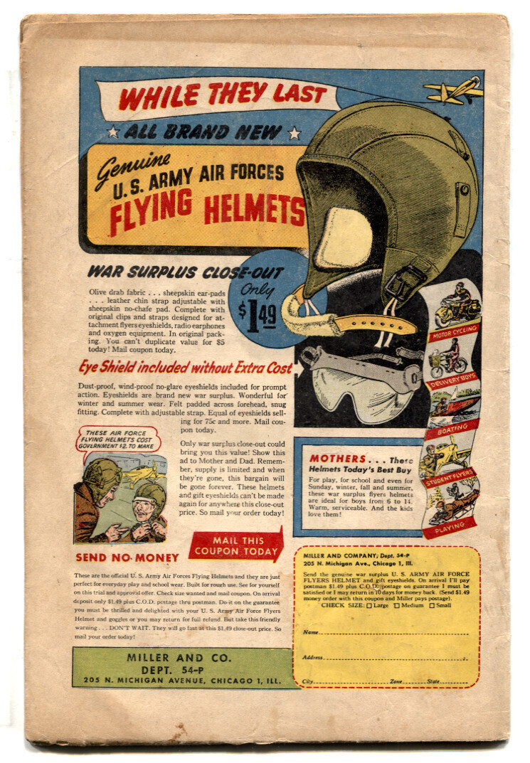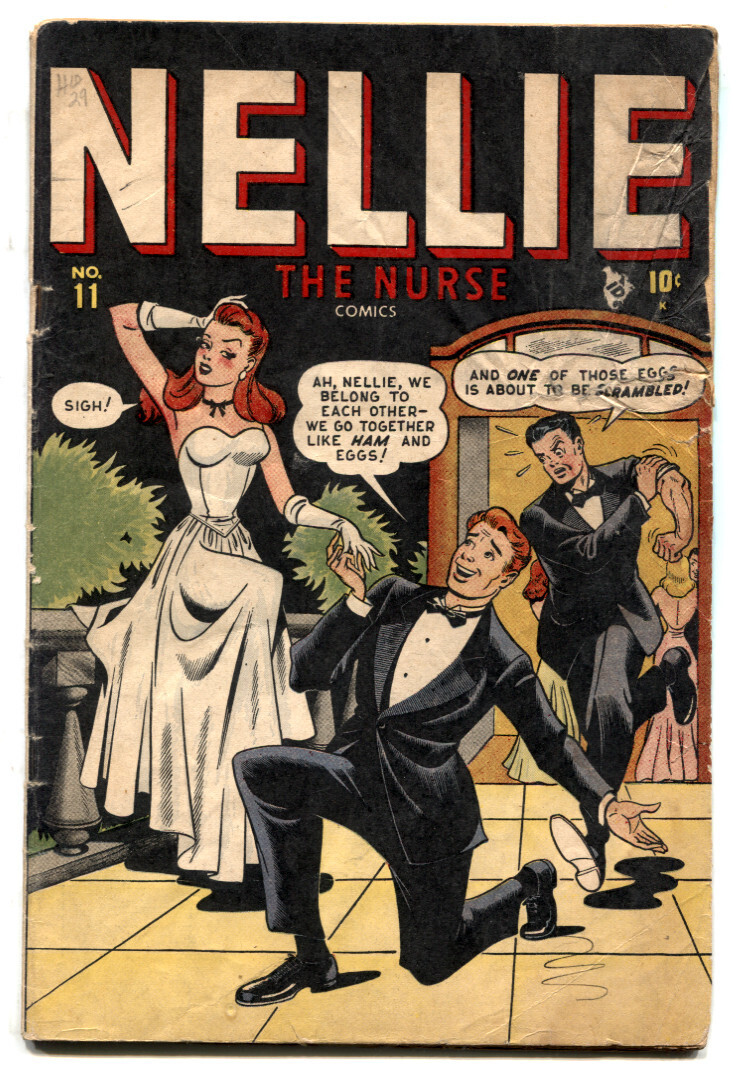 Grade: G-Nellie the Nurse #11 1948- Golden Age Kurtzman Hey Look G- -1/2 page "Hey Look" story. -Tessie and Rusty backup stories. -Harvey Kurtzman art -2" tear in front cover and 1st four pages, still readable. -Moisture staining. -Pages supple. Grade: G- SKU: LI-12-157