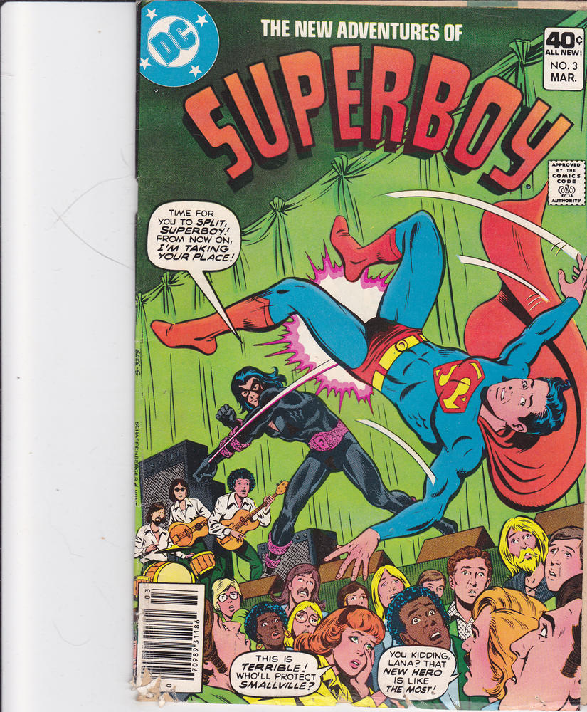 New Adventures of Superboy #3 by DC Comics copyright 1980. I have graded the comic book, using the Overstreet Grading Guide, at VERY GOOD/FINE with the following defects: Light stress marks along the spine. The corners are rounded. There is a piece missing from the lower left corner. There is some yellowing of the pages.Seller Information