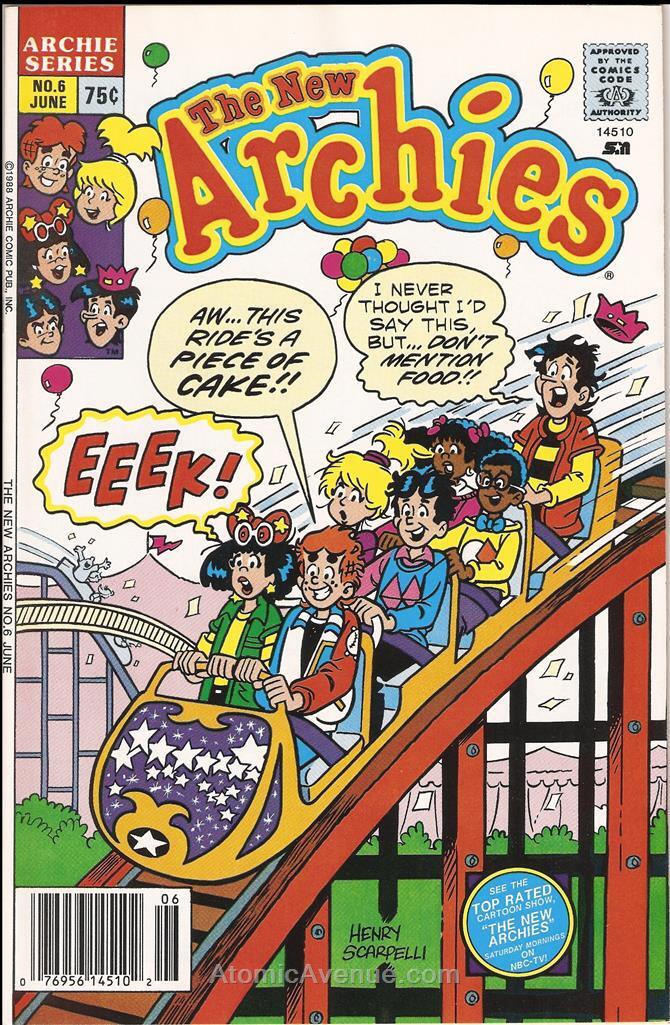 Item: New Archies, The #6 | Publisher: Archie | Cover Date: June 1988 | Cover Artist: Henry Scarpelli | With Economy shipping, each additional comic ships for just 50 cents more to customers in the USA. This listing contains a stock photo and information from ComicBase™ and © Human Computing. The stock photo is for reference only. If you would like to see a photo of the actual item, please message us prior to purchasing.Seller Information