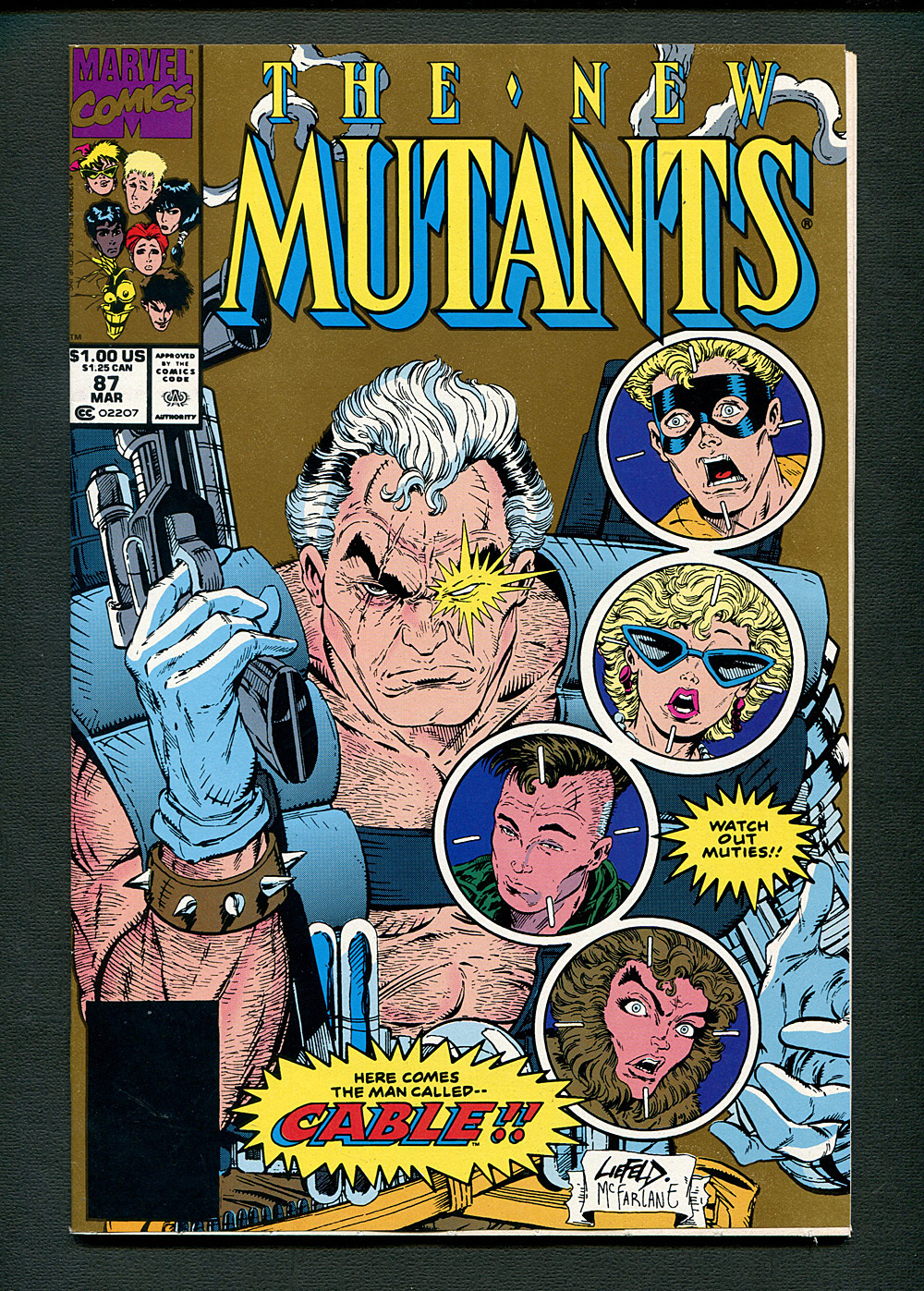 Gold Variant cover 2nd Print , 1st full appearance of Cable. Liefeld art. Liefeld/McFarlane. Cover pencils by Rob Liefeld, inks by Todd McFarlane. A Show of Power!, script by Louise Simonson, pencils by Rob Liefeld, inks by Bob Wiacek; The Mutant Liberation Front attacks more research stations; Mystique threatens Skids; a federal agent shoots Rusty; he and Skids allow the MLF to rescue them; the New Mutants return to New York; after trying to stop the MLF, Cable weighs his options. Part 2 of 4. 36 pages