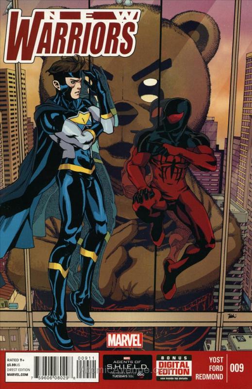 Item: New Warriors (5th Series) #9 | Publisher: Marvel | Cover Date: November 2014 | Writer: Christopher Yost | Artist: Tana Ford | Cover Artist: Takeshi Miyazawa | Appearances: Choke the Bear, Felinatus, Lt. Wally Layton, New Warriors, Haechi, Hummingbird, Justice, Nova (Sam Alexander), Scarlet Spider, Silhouette, Speedball, Sun Girl | With Economy shipping, each additional comic ships for just 50 cents more to customers in the USA. This listing contains a stock photo and information from ComicBase™ and © Human Computing. The stock photo is for reference only. If you would like to see a photo of the actual item, please message us prior to purchasing.Seller Information