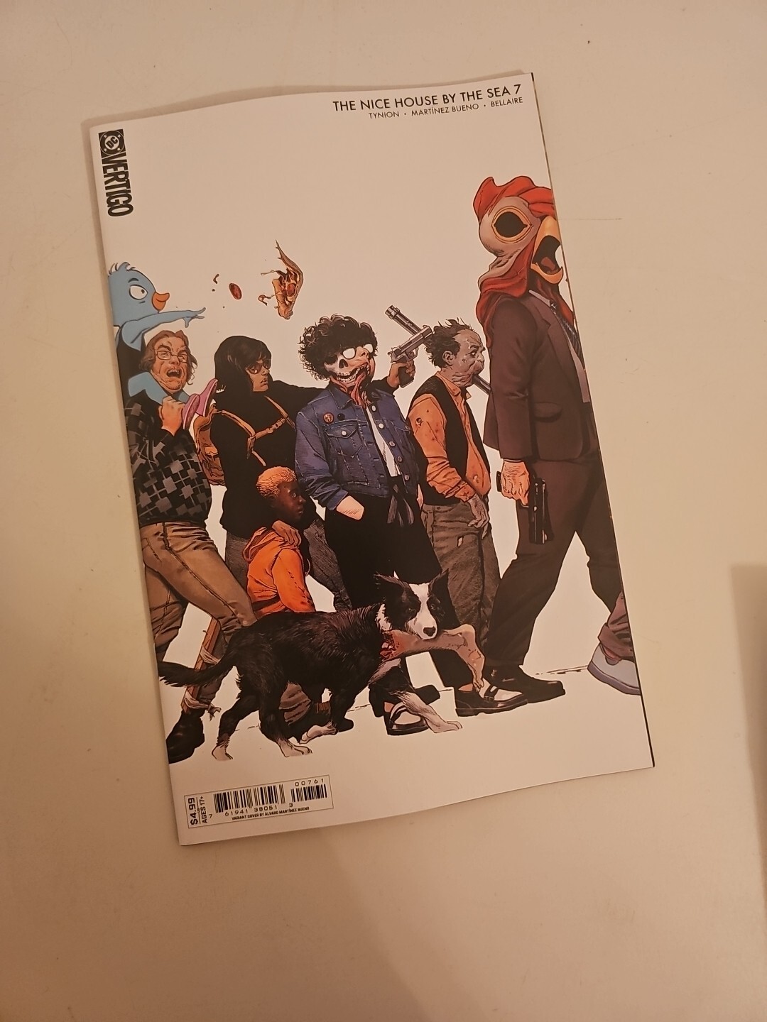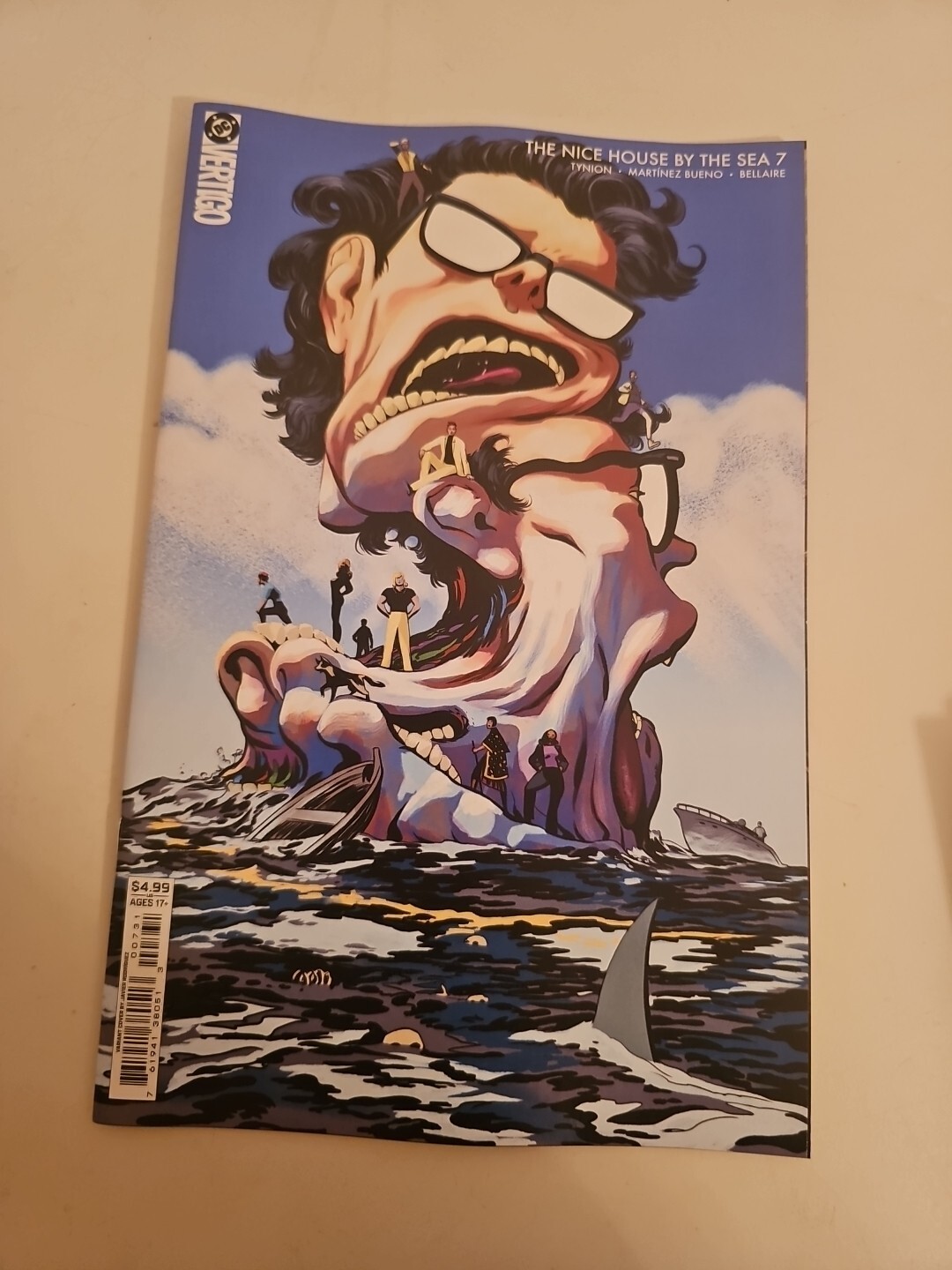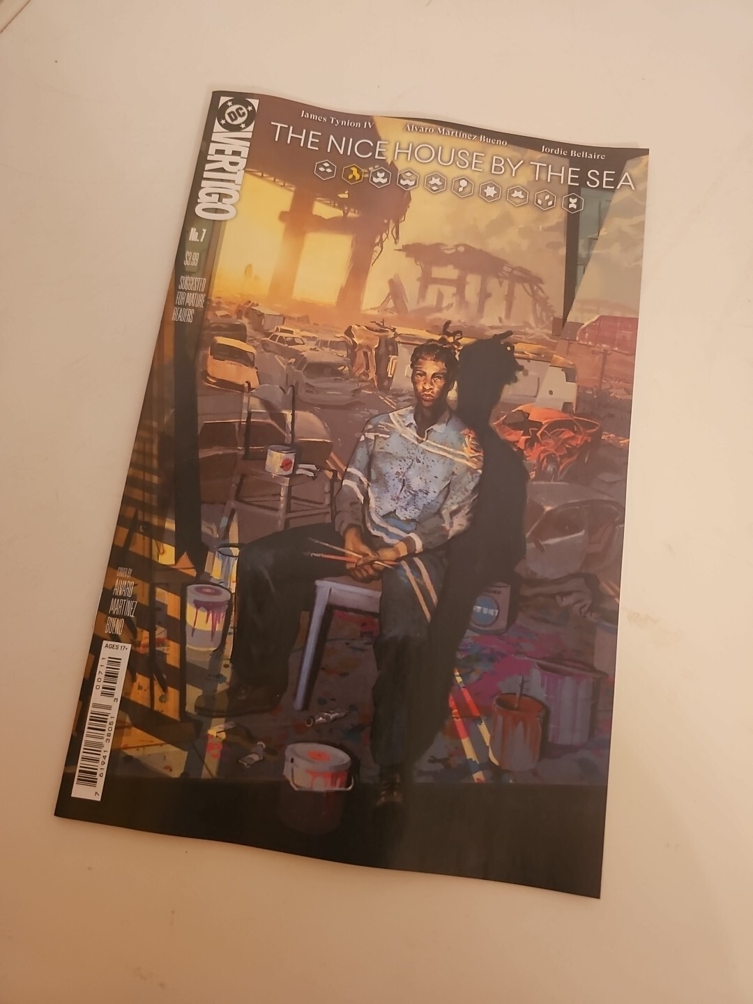 Grade: 9.6 Near Mint+This is the part of the story where the questions get harder to live with. A few issues ago, we met a new “house,” a new set of people handpicked and placed somewhere beautiful at the end of the world… and the unspoken rule has always been: don’t look too closely at how the magic trick works. In Nice House by the Sea issue 7, the mask slips. Secrets between friends start to feel like loaded weapons, and the comforting lie that “someone out there has a plan” curdles into something much more frightening. This is where the book stops asking, “What would you do if the world ended?” and starts asking, “What if the people who saved you are worse than what they saved you from?” If you’ve been following my work on The Nice House on the Lake, Department of Truth, or W0rldtr33, you know I love that thin line between intimacy and apocalypse—quiet conversations, ugly truths, and the horrible realization that you might be living in someone else’s experiment. Nice House by the Sea is that feeling turned up to 11, with Álvaro’s beautifully precise, unsettling linework making every room, every shoreline, feel just a little bit wrong. This listing includes four of the variant covers including Covers A, E (connecting with other Vertigo titles due out soon), and F (foil version of Cover A) by series artist Alvaro Martinez Bueno. And! Cover C by Javier Rodrguez who has been killing it on Deniz Camp's Absolute Martian Manhunter. And! TPB Volume 1 which includes the first 6 issues. Shipping is included, probably but not definitely USPS Priority Mail Flat Rate. Secured with rigid slabs of cardboard, FanboyFrantics will assure this arrives to you in one piece. Thanks for your support. All the best