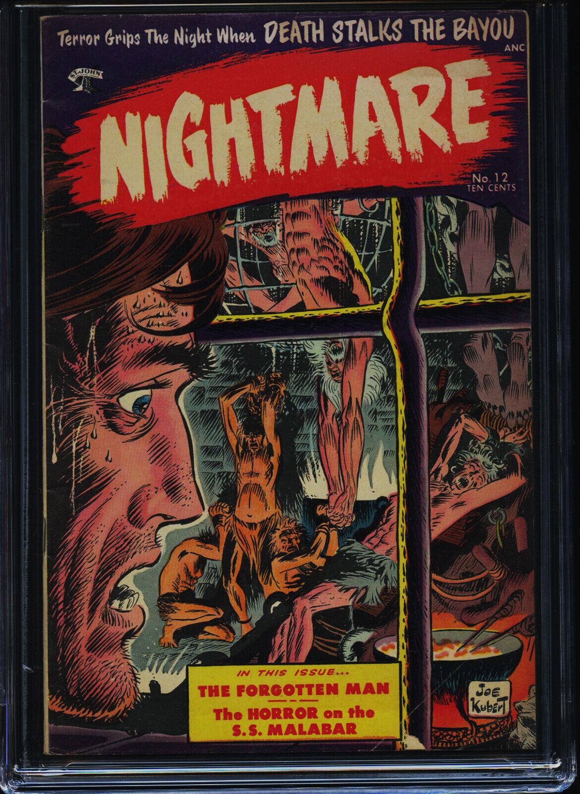 NIGHTMARE #12 - CGC-6.0, OW-W - St John - Kubert torture cover - Golden Age