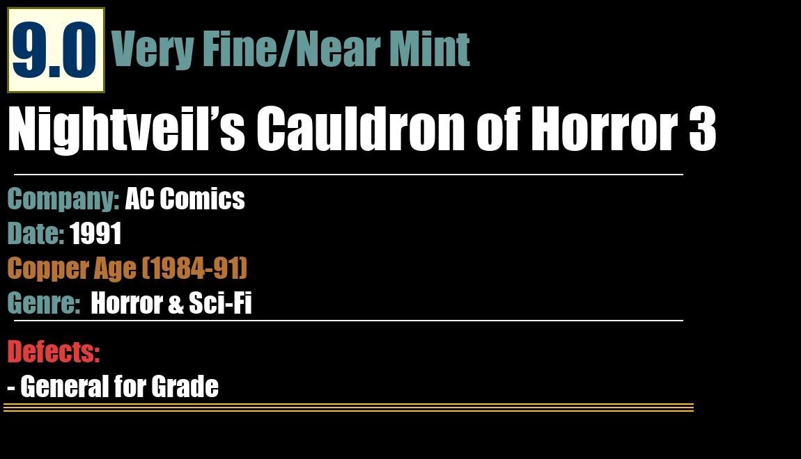 Grade: 9.0 Very Fine/Near MintShipping may take up to 5 business daysNightveil�s Cauldron of Horror 3AC Comics - 1991Horror & Sci-FiCopper Age (1984-91)9.0 Very Fine/Near MintDefects:- General for Grade:
