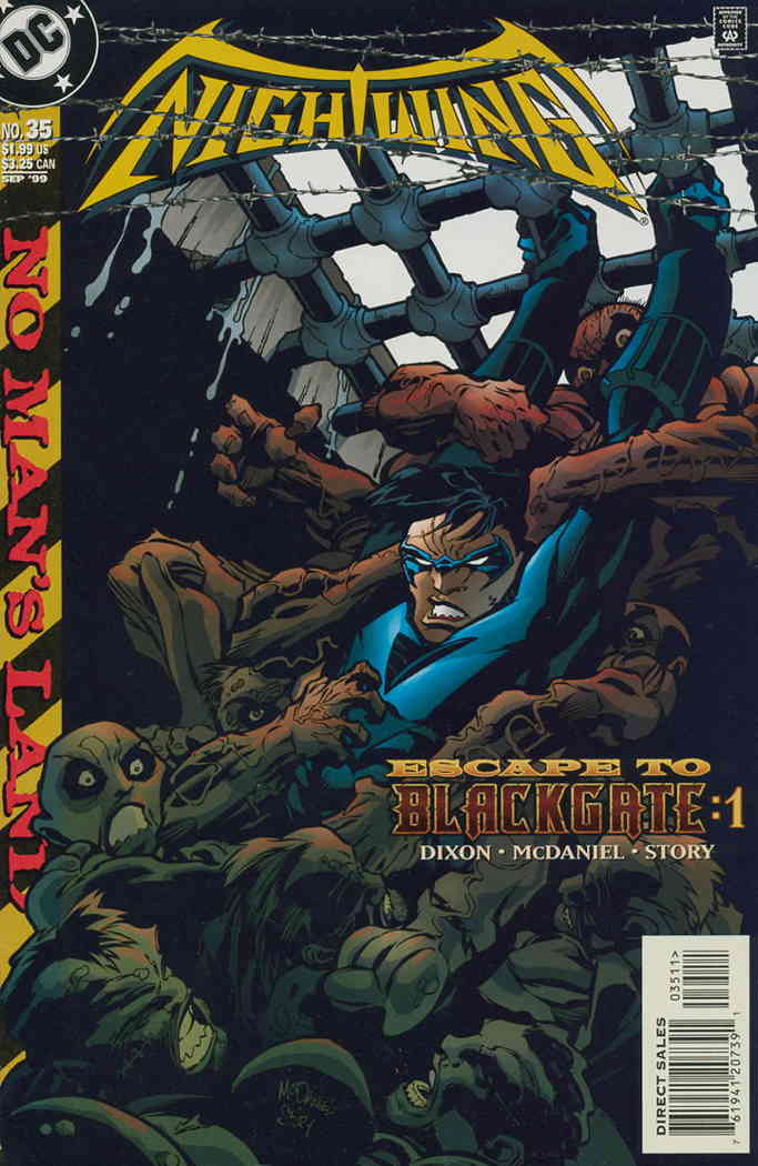 Item: Nightwing #35 | Publisher: DC | Cover Date: September 1999 | Writer: Chuck Dixon | Artist: Scott McDaniel | Cover Artist: Scott McDaniel | Appearances: Lock-Up, KGBeast, Trigger Twins | Storylines: Escape to Blackgate, Part 1; The Belly of the Beast | Notes: Versus Trigger Twins; Versus Lock-Up; Versus KGBeast; No Man’s Land | With Economy shipping, each additional comic ships for just 50 cents more to customers in the USA. This listing contains a stock photo and information from ComicBase™ and © Human Computing. The stock photo is for reference only. If you would like to see a photo of the actual item, please message us prior to purchasing.Seller Information