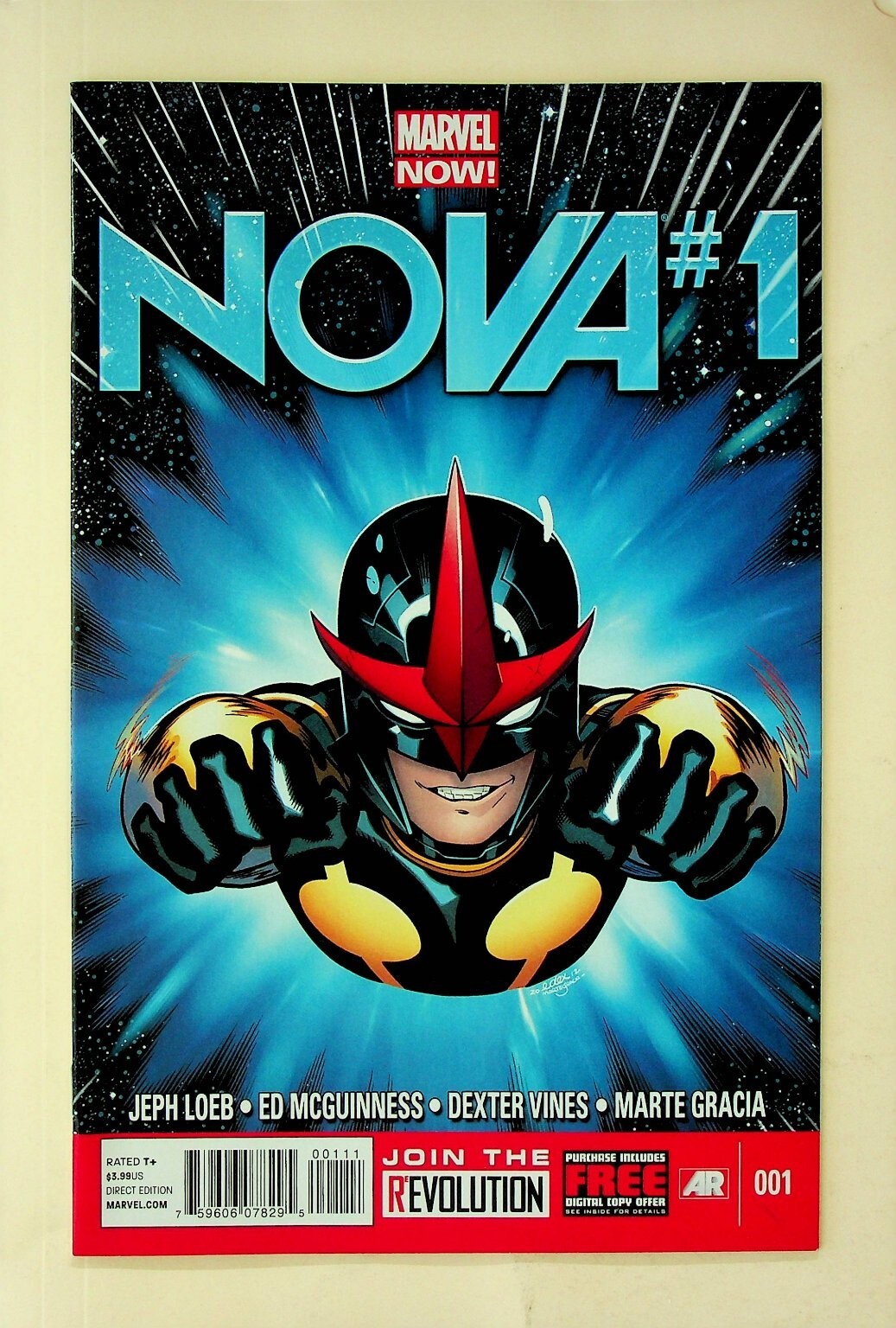 Grade: 9.2 Near Mint-...This is a single issue of Nova #1, published by Marvel Comics as part of the MARVEL NOW! initiative. This key issue introduces the new Nova, Sam Alexander. The comic features a dynamic cover and interior art by industry legends. Visible creators on the cover include Jeph Loeb, Ed McGuinness, Dexter Vines, and Marte Gracia. This Direct Edition comic book is a must-have for collectors of modern Marvel Comics and fans of the Nova character.This listing includes one (1) comic book. The issue features a cover price of $3.99 US and is rated T+. The back cover features an advertisement for the Brooklyn Nets.Verified Specifications:Publisher: MarvelSeries Title: NovaIssue Number: #1Item Type: Single IssueEra: Modern AgeFormat: Direct EditionKey Features: First Issue, Marvel Now!Included Components: 1x Comic BookBarcode/UPC: 759606078266Publication Year: 2013 (estimated based on Marvel Now! branding and character debut)