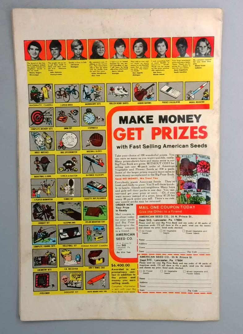 Nova faces off against a powerful adversary in this issue, with the cover proclaiming "He's Here! The Human Rocket!" The back cover features a classic 1970s mail-away promotion for American Seed Company prizes, a common incentive in comics of this era. The story teases "World's War One Begins! Attack From Space!" setting up an intergalactic conflict.