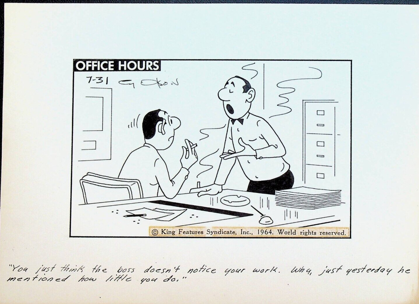 Office Hours by Cy Olson Original Comic Strip Art July 31 1964 Lazy Worker