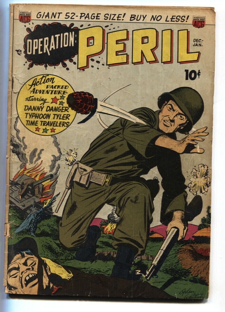 Grade: G+Operation Peril #2 John Wesley Harden- Korean War 1950 G+ Korean War cover by Ogden Whitney. Sci-fi story. John Wesley Harden. Large tear in first page. Grade: G+ SKU: PULP016-225
