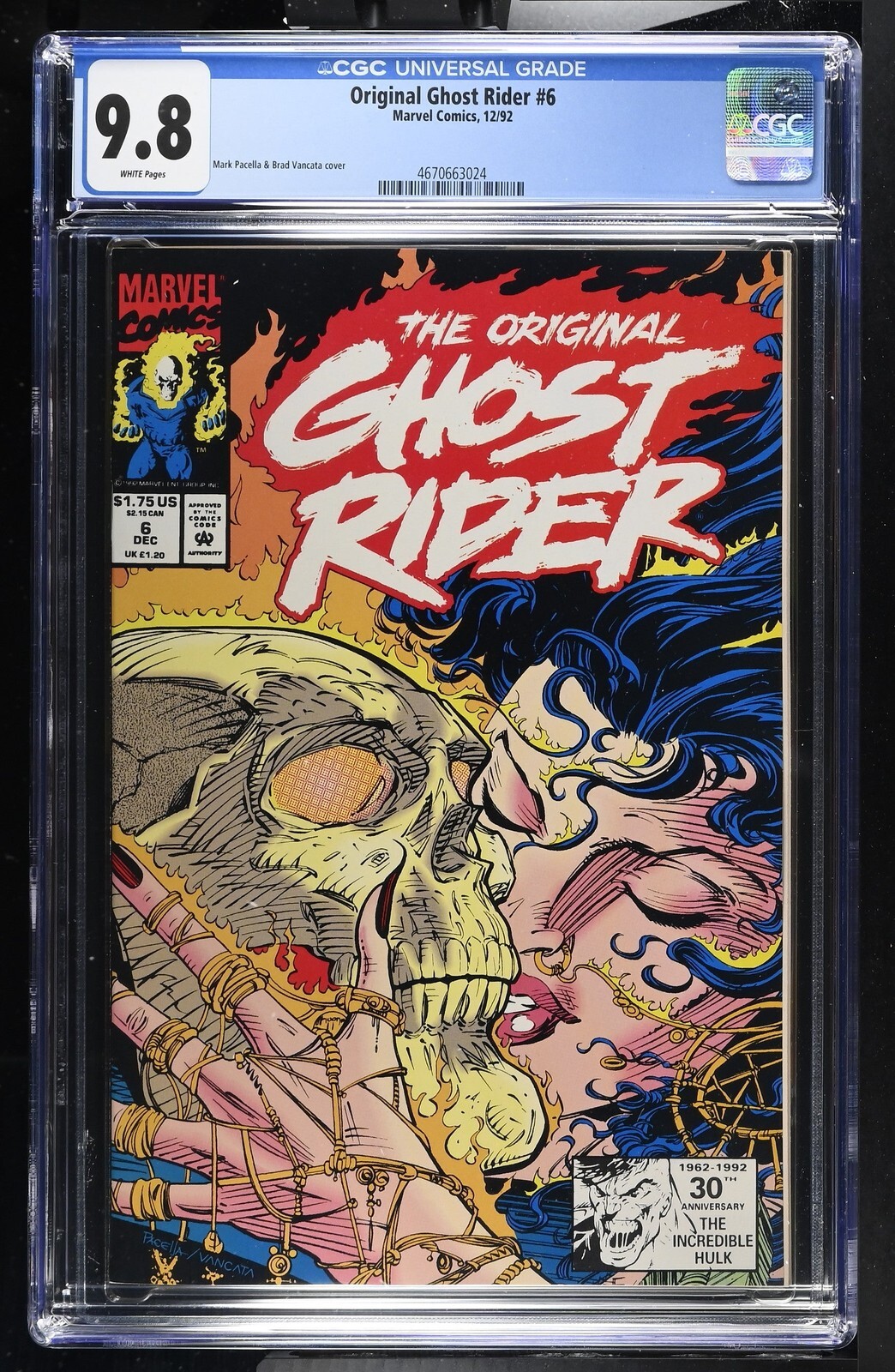 Original Ghost Rider #6 from 12/92 offers a glimpse into the era's iconic storytelling. This issue is a must-have for collectors. Add this CGC 9.8 graded comic to your collection today!Attribute DetailsCertNumber 4670663024DisplayGrade 9.8GradeCategory ModernPageQuality WHITEArtComments Mark Pacella & Brad Vancata coverCollectibleID 195190CollectibleType CTitle Original Ghost RiderIssue 6IssueDate 12/92Publisher Marvel ComicsYear 1992PopulationAtGrade 3population_9_8 3Sales History