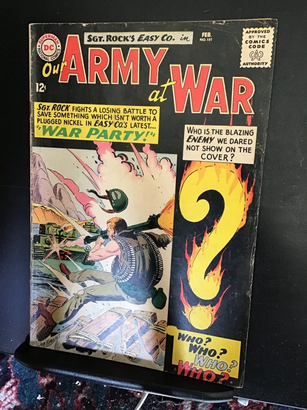 Our Army at War #151 (1965) This is the first appearance of enemy ace by Joe Kubert! This book has deep rich color on this all time classic hard to get in high grade black Joe Kubert Sergeant Rock. cover! With cream/slight heavy cream pages and cream inner covers. We have adjusted the grade accordingly. for the page quality and stain wear on the covers. With wear appropriate grade.. The book is well attached at the spine and the centerfold staplesSeller Information