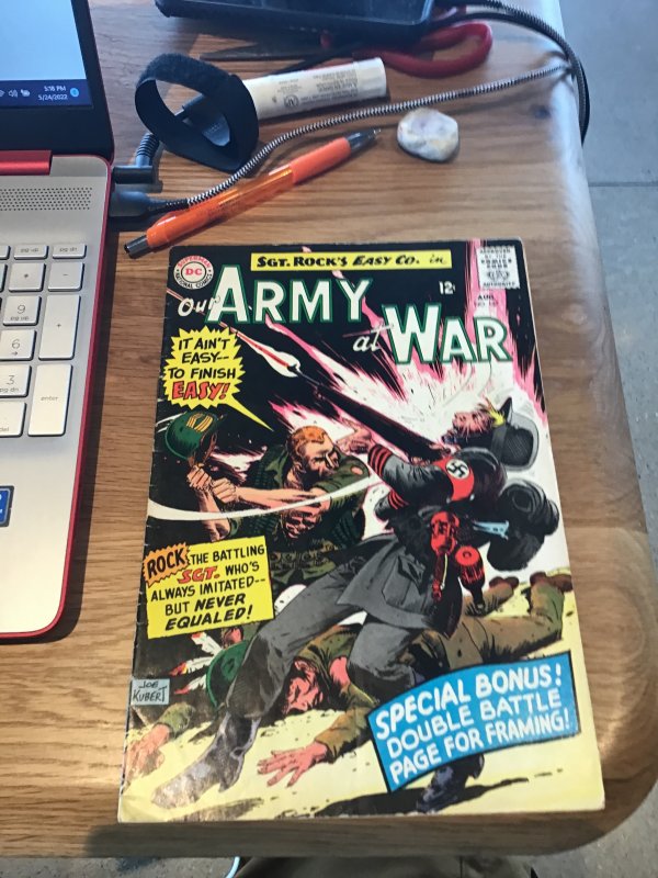 Our Army at War #157 (1965) This book has deep rich color and nice eye-appeal with cream/heavy cream tint pages and cream inside covers. With overall light wear appropriate grade. Note: any shadows on the time it is or do to the camera and not on the books themselves unless duly noted.Seller Information