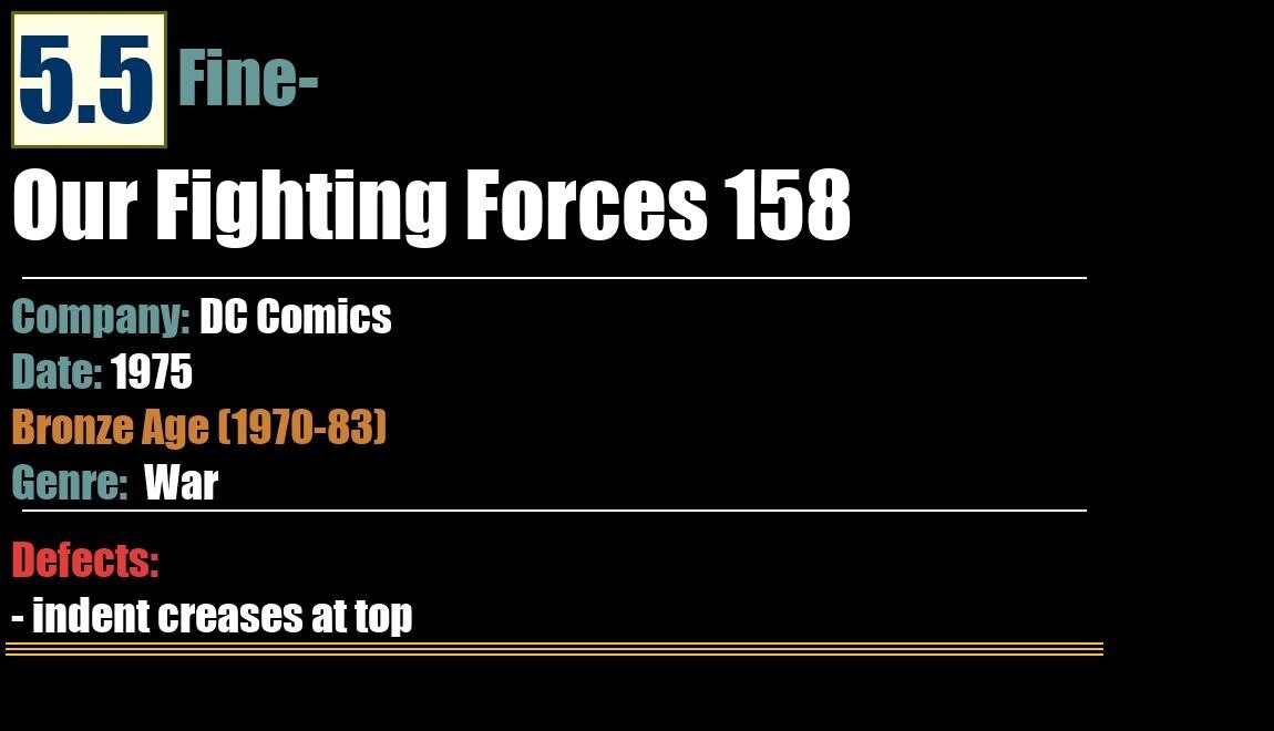 Grade: 5.5 Fine- Shipping may take up to 5 business daysOur Fighting Forces 158DC Comics - 1975WarBronze Age (1970-83)5.5 Fine-Defects:- indent creases at top