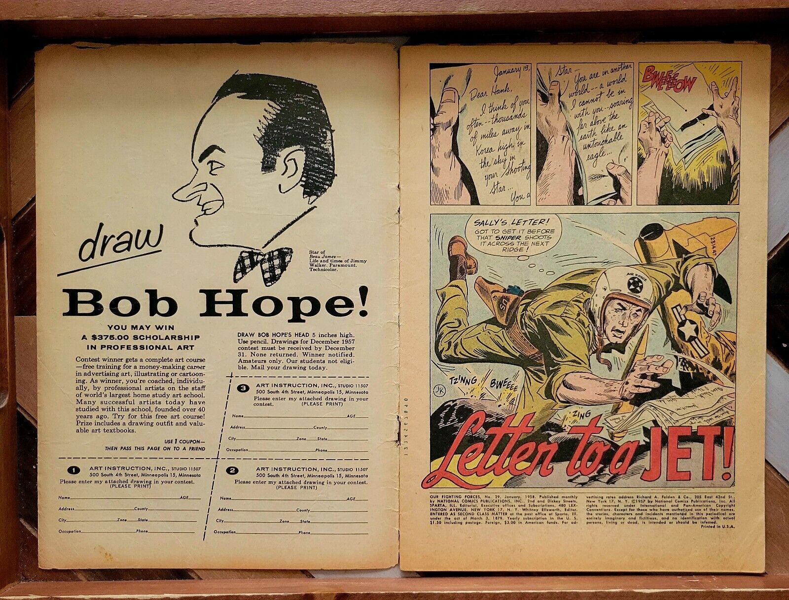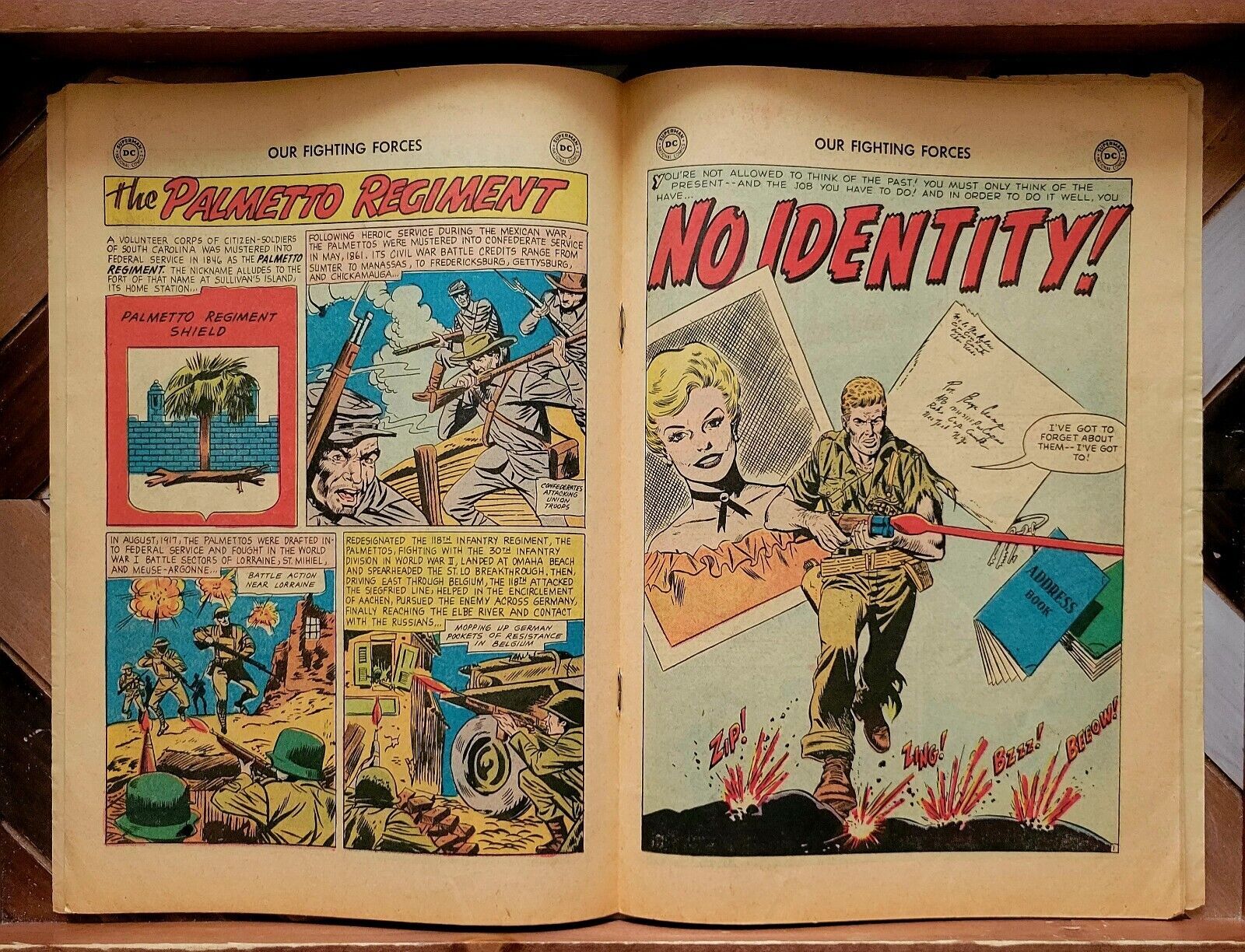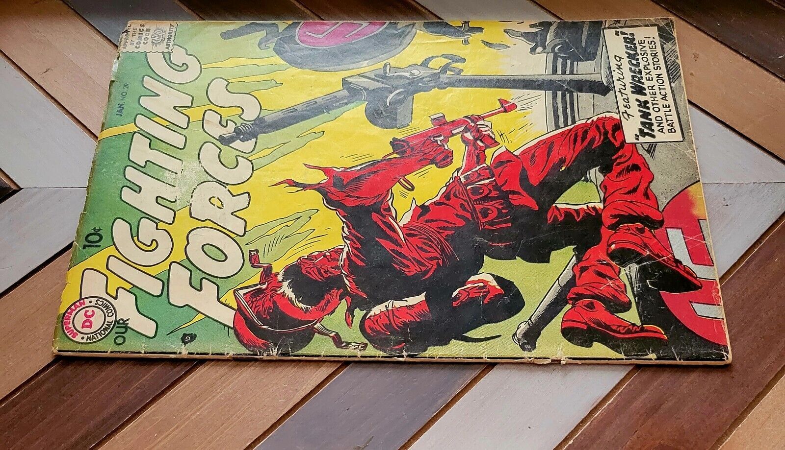 OUR FIGHTING FORCES #29 G/VG (DC 1958) Classic Cover by Joe Kubert Joe Kubert cover. Kubert, Jack Abel, Carmine Infantino, and Jerry Grandenetti art. ~~~~~~~~~~ Explosive battle action tales! In this issue: "Letter to a Jet!" by Bob Haney and Joe Kubert; "Bottom of the War!" by Ed Herron and Jack Abel; "No Identity!" by Bill Finger, Carmine Infantino and Frank Giacoia; "Tank Wrecker!" by Haney and Jerry Grandenetti; War Words 1-pager by Julius Schwartz, Morris Waldinger and Tommy Nicolosi; and 1-page story "The Palmetto Regiment" by Schwartz, Waldinger and Nicolosi. 10 cent cover price ~~~~~~~~~~ Solid G/VG copy of this Silver Age book. The book is complete, lays flat with bright colors, and excellent eye appeal. The items shown are the exact books you will receive. In this grade, there may be any variety of blemishes, tears, tanning, moisture stains, rusty/loose staple, etc., and are priced accordingly. All grades are approximate. Please review the photos and ask questions as needed. All books will ship fast and securely. See my feedback & buy with confidence.Seller Information