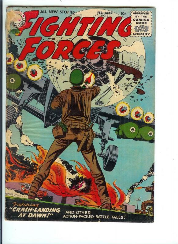 Our Fighting Forces, #9, February-March 1956. Condition Good. (Est. Overstreet Price guide Value 28.00 @ GD, selling this Comic for only $16.95)."Crashlanding at Dawn," "Empty-Handed Soldier," "Battle Map" (art by Joe Kubert?), and "The Safe War!" (art by Russ Heath). Quarter-page Wildroot Cream-Oil ad featuring Fearless Fosdick with art by Al Capp. Cover price $0.10.