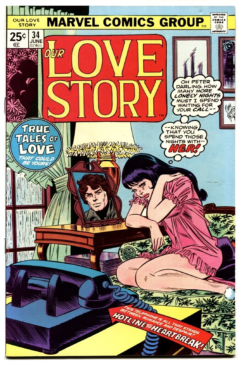 Grade: VF+Our Love Story #34 comic book Marvel-John Romita-Buscema-lingerie-Spider-man -Lingerie cover -Art by Romita and Buscema -One page of Spider-man -Difficult to locate in higher grades Grade: VF+ SKU: U2-24-153