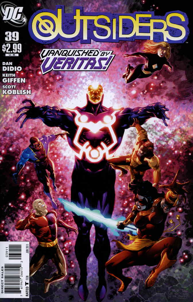Item: Outsiders, The (4th Series) #39 | Publisher: DC | Cover Date: June 2011 | Writer: Dan Didio, Keith Giffen, Paul Dini | Artist: Keith Giffen, Carlos D’Anda | Cover Artist: Philip Tan | Appearances: Geo-Force (Brion Markov), Freight Train, Katana, Olympian, Owlman (Roy Raymond Jr.), Black Lightning (Jefferson Pierce), Grace, Metamorpho, Halo, Herald (Mal Duncan), Looker, Thunder (Anissa Pierce), Batman (Bruce Wayne), Amanda Waller | Storylines: Who Handles The Truth?; Ruins | Notes: Includes preview of Batman: Arkham City #1 | With Economy shipping, each additional comic ships for just 50 cents more to customers in the USA. This listing contains a stock photo and information from ComicBase™ and © Human Computing. The stock photo is for reference only. If you would like to see a photo of the actual item, please message us prior to purchasing.Seller Information