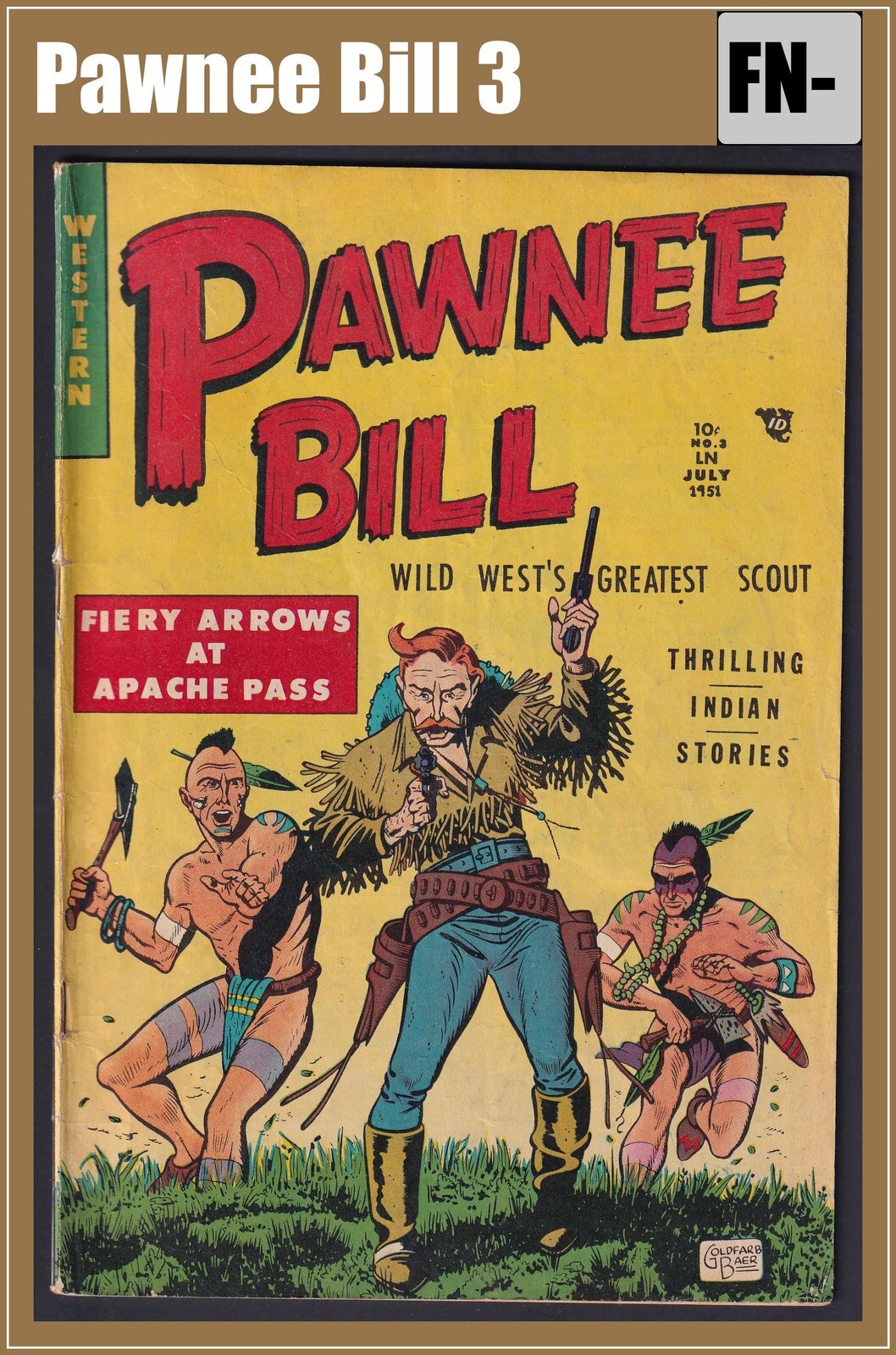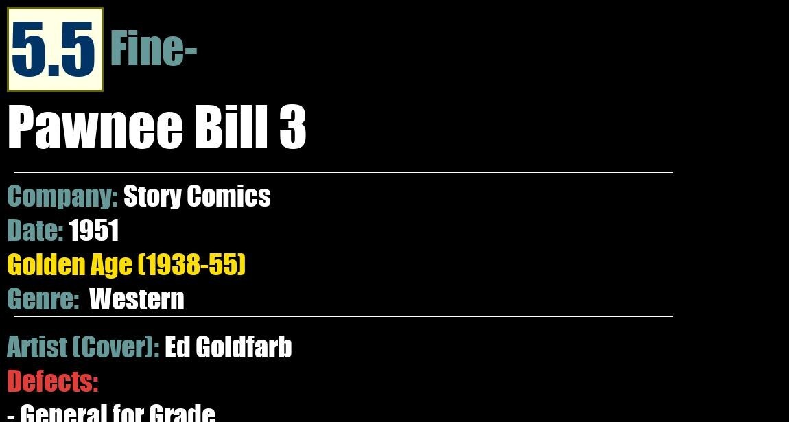 Grade: 5.5 Fine-Shipping may take up to 5 business daysPawnee Bill 3Story Comics - 1951WesternGolden Age (1938-55)5.5 Fine-Artist (Cover): Ed GoldfarbDefects:- General for Grade: