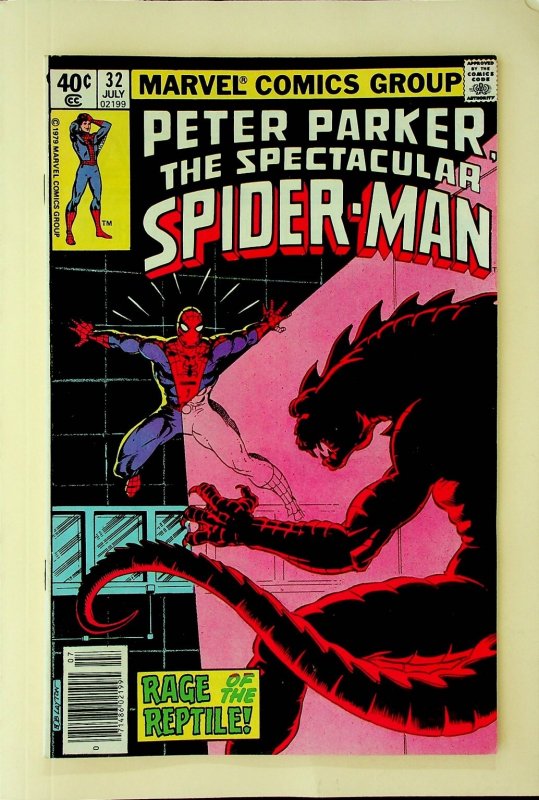 Grade: 9.2 Near Mint-...This is a single issue of Peter Parker The Spectacular Spider-Man #32 published by Marvel Comics Group. This classic comic book features the story "Rage of the Reptile!" and includes an appearance by The Lizard (Doctor Curt Connors). It is a Newsstand Edition, indicated by the visible barcode on the cover. The cover price is 40¢ and the publication month is July, with a copyright year of 1979, placing it squarely in the Bronze Age of comics. This collectible Marvel comic showcases iconic superhero action and is a key issue for fans of Spider-Man and his classic villains. This listing includes one (1) comic book, as pictured.Verified Specifications:Publisher: Marvel Comics GroupSeries Title: Peter Parker The Spectacular Spider-ManIssue Number: #32Item Type: Single IssueEra: Bronze AgeFormat: Newsstand EditionKey Features: First appearance (of this story arc) of The Lizard, "Rage of the Reptile!" storyIncluded Components: 1x Comic BookCountry of Origin: USA