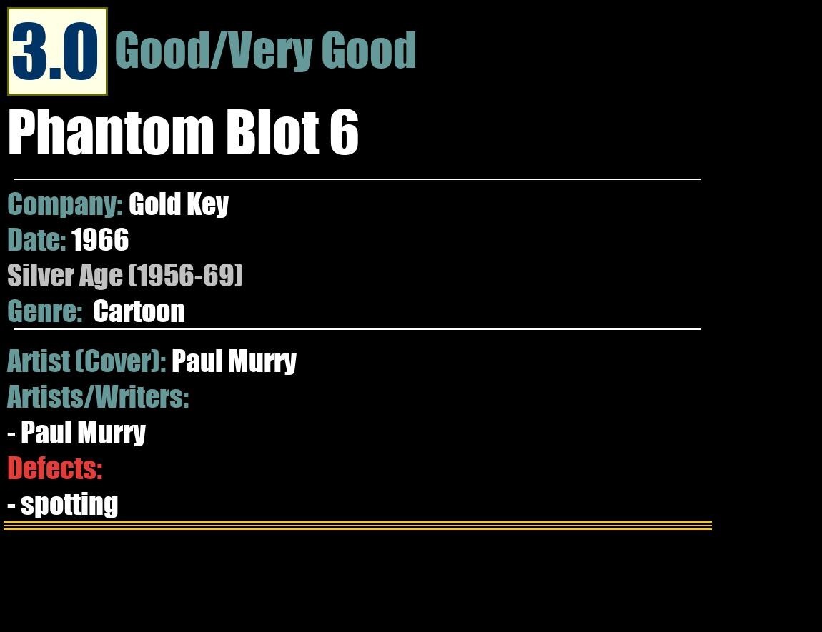 Grade: 3.0 Good/Very Good Shipping may take up to 5 business daysPhantom Blot 6Gold Key - 1966CartoonSilver Age (1956-69)3.0 Good/Very GoodArtist (Cover): Paul MurryArtists/Writers:- Paul MurryDefects:- spotting