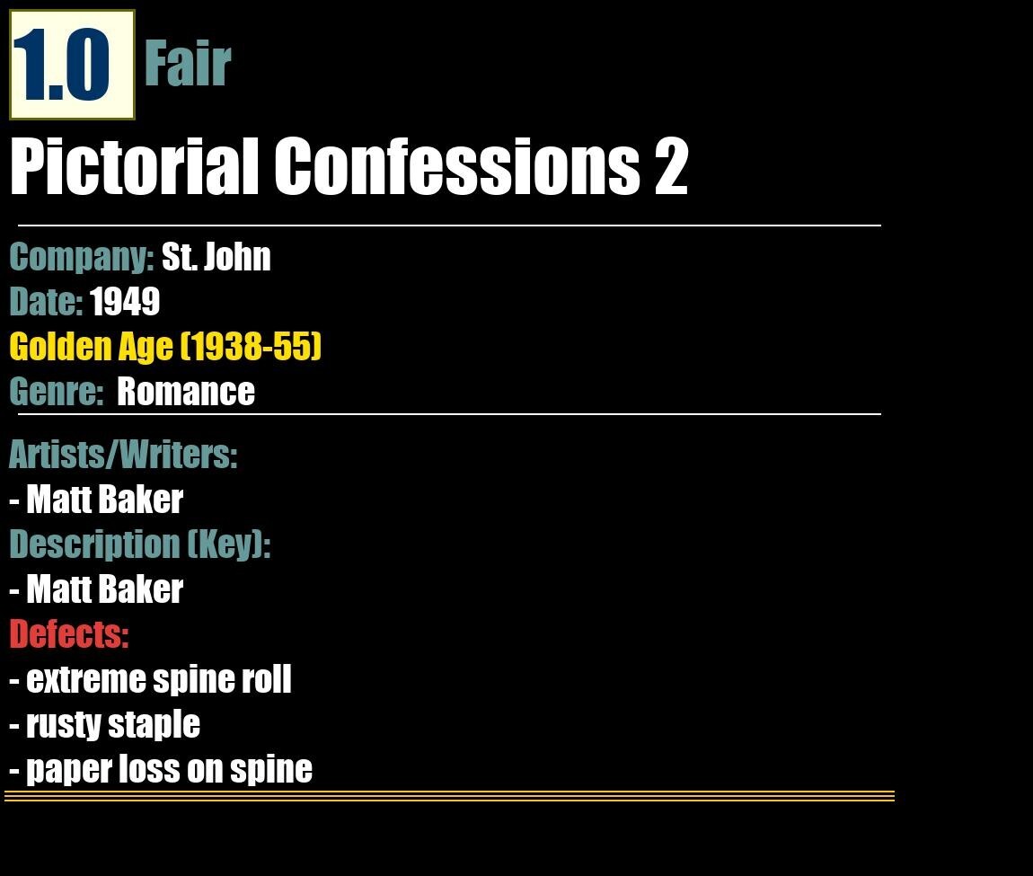 Grade: 1.0 FairShipping may take up to 5 business daysPictorial Confessions 2St. John - 1949RomanceGolden Age (1938-55)1.0 FairArtists/Writers:- Matt BakerDescription/Key:- Matt BakerDefects:- extreme spine roll- rusty staple- paper loss on spine
