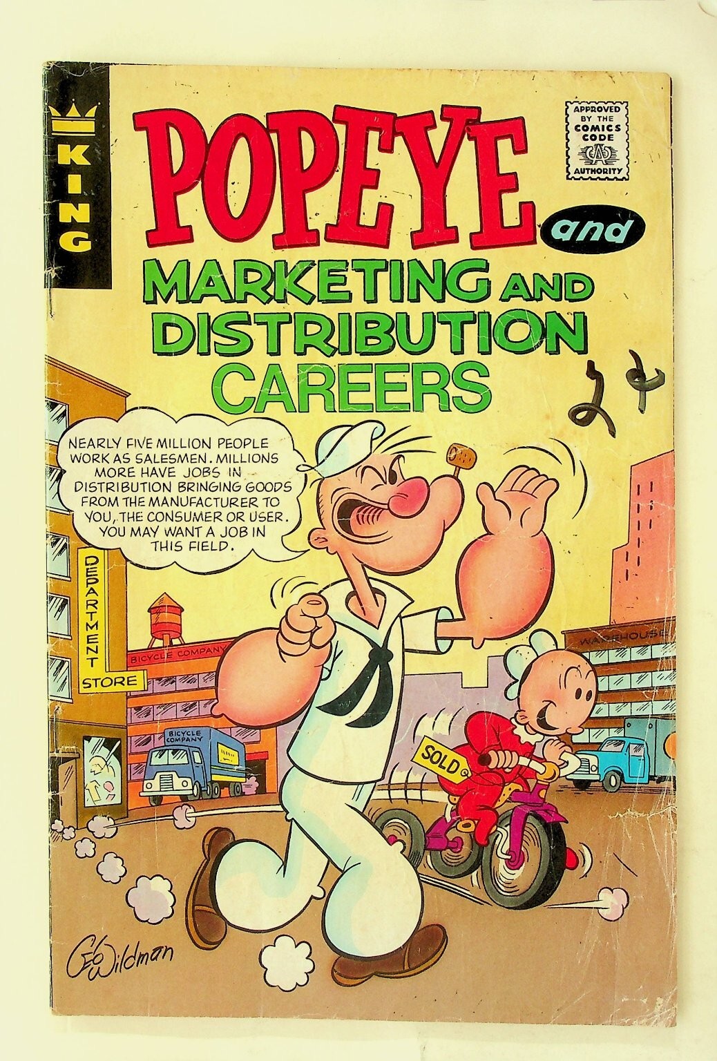 This is a single issue of the comic book "Popeye: Marketing and Distribution Careers" #E-9 published by King Features Syndicate. This unique educational comic features Popeye and other beloved characters, focusing on careers in marketing and distribution. The comic prominently displays the "Approved by the Comics Code Authority" seal, indicative of its publication era. The cover art is signed by Wildman. The back cover continues the theme with Mr. Zoftee and children, illustrating various aspects of route sales careers.This listing includes one (1) comic book as pictured. It is a classic collectible for fans of Popeye, vintage comics, and educational or promotional comic book history. Discover this fascinating piece of Silver Age comic art and storytelling, perfect for any collector of King Features comics or unique superhero-adjacent items.Verified Specifications:Publisher: King Features SyndicateSeries Title: PopeyeItem Type: Single IssueEra: Silver AgeFormat: Standard Comic BookKey Features: Educational Comic, Comics Code Authority Seal, Wildman Cover ArtIncluded Components: 1x Comic BookStyle: ColorCharacter: Popeye, Swee'Pea