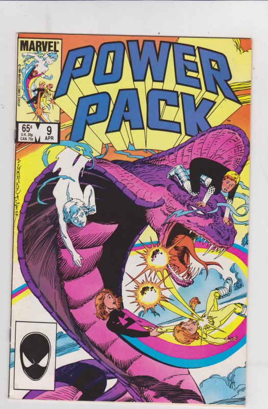 Power Pack #9 by Marvel Comics copyright 1984. I have graded the comic book, using the Overstreet Grading Guide, at FINE+ with the following defects: Light stress marks along the spine. Corners are rounded. There is yellowing of the pages.Follow me on twitter @denofwonder for update.