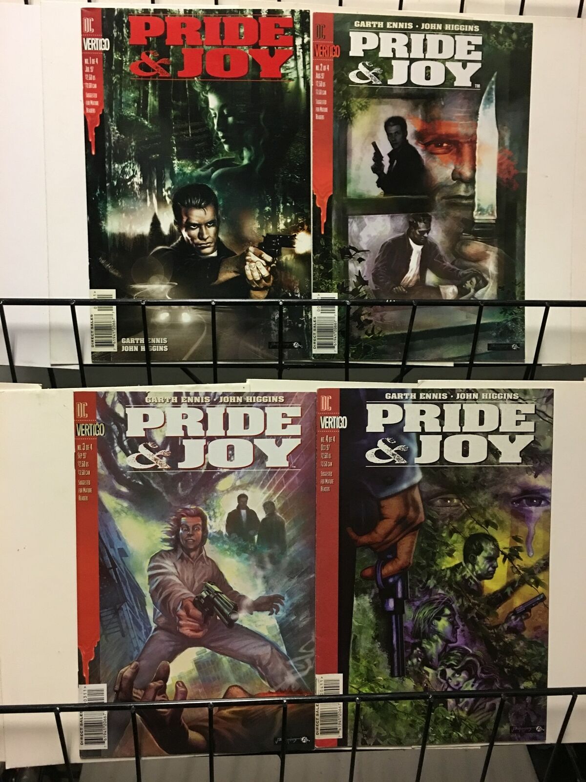 FREEBIE FUN PACKS with EVERY package See our e bay store for MORE SETSMORE STORY ARCS Yes we COMBINE SHIPPING - $5 for first item, 25 cents for each additional more EXCLUSIVE kochcom STORE ONLY listings!!!New Listings Dailysee our Hip STORE for 1000s more SETS & ASSORTMENTSPRIDE & JOY (1997 VERTIGO) 1-4 Thrilling Suspense Story !!!Dated: July-Oct 1997Story & Art: Garth Ennis & John Higgins*** Contains Issue #'s 1-4 ***4 issue mini-series - complete!F or better, mostly UNCIRCULATED glossy VF or better copies ~End Of Description ======================================lSHIPPING DISCOUNT FOR U.S. CUSTOMERS!AFTER the first $5.00 shipping, add only 25 cents for each additional win/buy. (Excludes collections, inventories, posters, cgc's and lots consisting of70 books/mags/magazines or more - for lots & collections, see listings for applicable shipping terms).Warehouse pick ups by appointment - come on by check us out (no shipping for pick ups, obviously) SHIPPING DISCOUNT FOR INTERNATIONAL CUSTOMERS! (Canada and Mexico see below)Minimum shipping is $13.00 for one comic, magazine; $18.95 for up to 3 comics, 2 magazines, 1 trade paperback. For larger orders of comics, magazines, and books with no specifications in our listings, $18.95 plus $1.25 per comic, 2.50 per magazine, 5.00 per book.  SHIPPING DISCOUNT FOR CANADA AND MEXICO CUSTOMERS!Shipping for 1-5 comics is $12, for 1-2 magazines also $12; 1 book is $12 unless otherwise specified in the listing, add $1.50 for each additional comic, $2.50 per magazine, 4.00 per book.unless otherwise specified   Holiday (AND ALWAYS) SHIPPINGSCHEDULE: Almost all auctions ship within 1 business day after receiving payment, usually in 24 hrs or less; Nifty FREEBIE FUN PACK of Comics and Cards accompanies ALL packages EXCEPT (the FINE print) when packaging and shipping cost prohibit freebie fun pack inclusion (some non-domestic orders and some poster orders) Payment may be made via PayPal or credit cards.Pick up by appointment for all auctions and listings. Call [phone removed by Hip] for pickup payment options.AMERICANEXPRESS,VISA,MASTERCARD DISCOVER OKetc).End Of Postage and Payment Terms ======================================The Avalanche Continues!Check out our Hip store for spectacular sales and SpecialsNEW LISTINGS DAILY!!!! ALERT! We are STILL sorting 750 000 comics - possibly the biggest onetime comic sort EVER undertaken. Watch our auctions, watch our e bay store for sales andspecials. We are about to sort the letter "X" (over 200 boxes, 60 000 comics)1000's of listings!FREE giveaways and blaring trumpets in 20 key categoriesThe Kochcom Hip Store!(Everyday is a holiday in Brooklyn)Just Click Here For The Great Kochcom Hip Store LinkNifty Free Fun Packs withevery shipment!! A KOCHCOM AUCTIONThe Endless Convention!~Check out our other auctions!!! More sets, more breakouts, more trade paperbacks, more movies and horrorNifty Freebie Fun Packs with every shipment!! THE FINE PRINT: except when packaging and shipping cost prohibit freebie fun pack inclusion (some non-domestic orders and some poster orders) - the fine printMutants among us.~Check out our other auctions!!! More sets, more breakouts, more trade paperbacks, more movies and horrorNifty Free Fun Packs with every shipment!!Mutants amoung us.Mutants amoung us. Powered by Hip Turbo ListerThe free listing tool. List your items fast and easy and manage your active items.