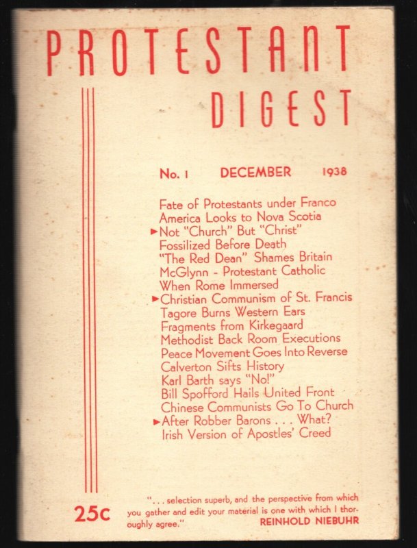 Protestant Digest#1 12/1938-1st issue-digest format-Methodist back Room Execution's -First issue -"Methodist Back Room Executions" -"Chinese Community Go To Church" -Unique -Digest format Title: Protestant Digest Is ... Read More
