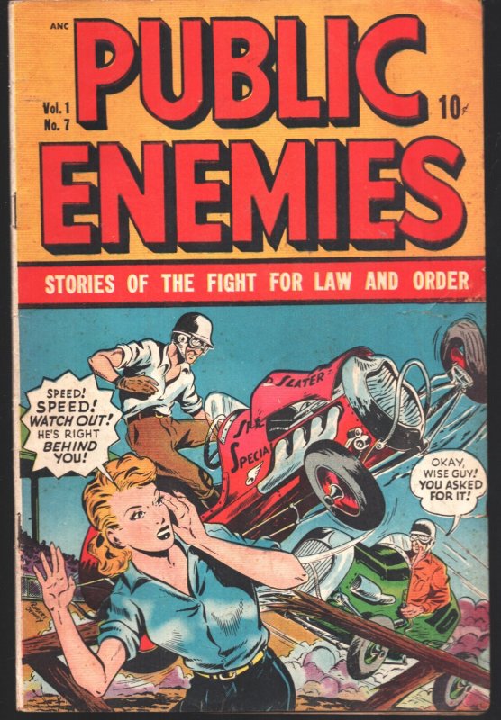 Public Enemies #7 1949- Midget auto race crash by Robert Jenny- Al McWilliams -Midget auto race crash cover by Robert Jenny -Injury to eye panel-violence-murder-hot cars -Al McWilliams art. -"Death on The Dirt Track" -Elusive issue Title: Public Enemies Issue: 7 Grade: VG SKU: LI-130-095Seller Information