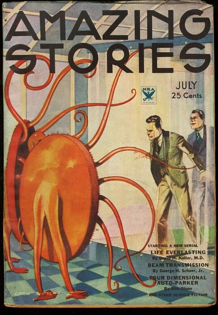 Amazing stories 1934 jul-early science fiction pulp fn robotic alien cover. Jules verne story. Outstanding high grade estate copy. Early science fiction pulp. Fn condition, beautiful spine. Grade: fn sku: u2-53-007