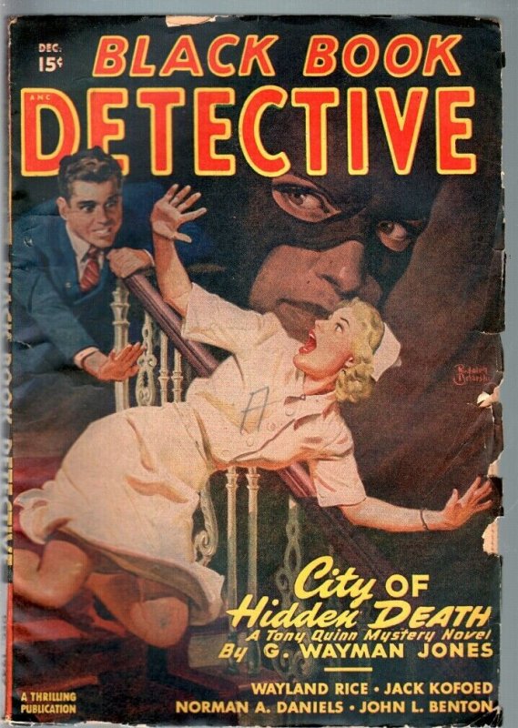 Black book detective 1947 dec-black bat-pulp-hero pulp-rare vg- nurse assaulted as black bat watches on this menacing pulp cover by r. Belarski. Black bat pulp crime novel. Grade: vg- sku: amx-05-046