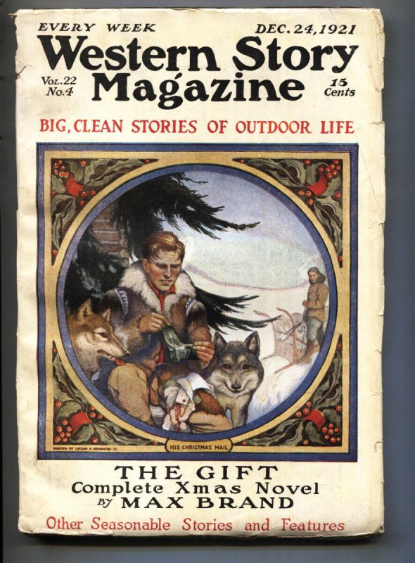 Western Story 12/24/1921-early pulp format issue-X-Mas cvr-Max Brand -Christmas cover by Lecian V. Bernuth. -"THE GIFT" by Max Brand. -How the west was won-Lewis and Clark. -Pulp fiction by Robert J. Horton, Art Noel and others. -Early issue, rare, over 100 years old. -Small glue inside spine. Grade: VG SKU: EB-16-152