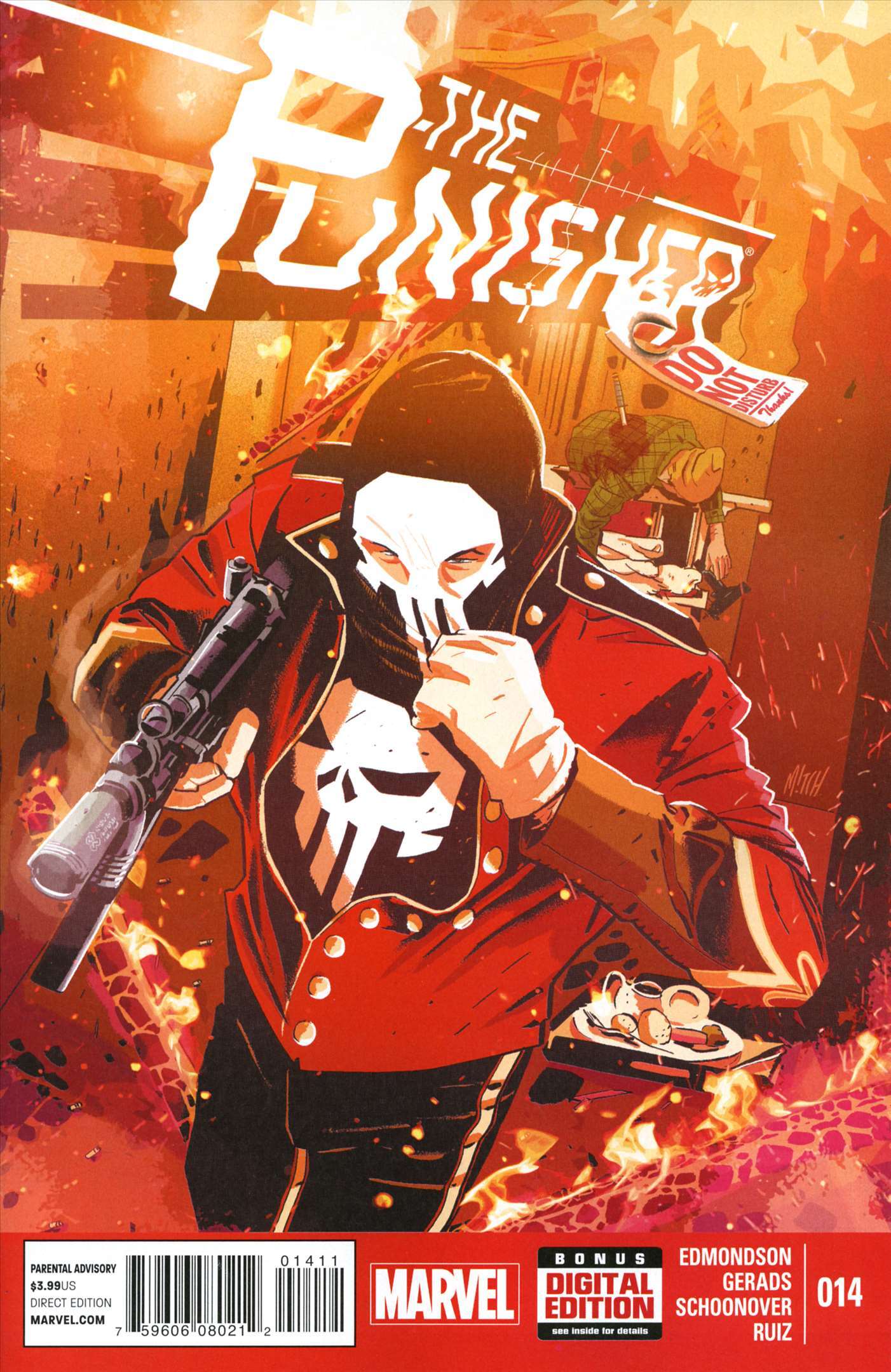 Item: Punisher (10th Series) #14 | Publisher: Marvel | Cover Date: March 2015 | Writer: Nathan Edmondson | Artist: Mitch Gerads, Brent Schoonover | Cover Artist: Mitch Gerads | Storylines: Dawn’s Early Light | With Economy shipping, each additional comic ships for just 50 cents more to customers in the USA. This listing contains a stock photo and information from ComicBase™ and © Human Computing. The stock photo is for reference only. If you would like to see a photo of the actual item, please message us prior to purchasing.Seller Information
