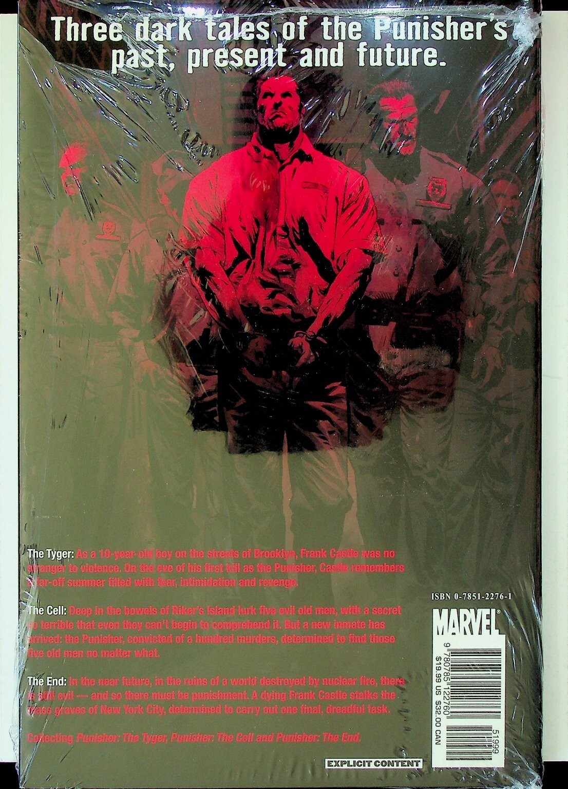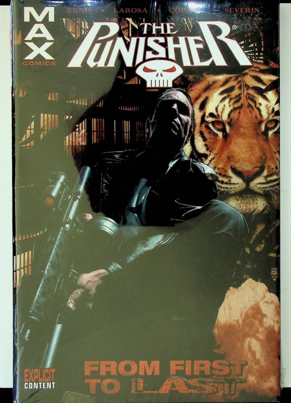 This is a Trade Paperback (TPB) graphic novel titled 'The Punisher: From First to Last,' published by MAX Comics, an imprint of Marvel Comics. This collection features three dark tales focusing on the Punisher's past, present, and future, including the stories 'The Tyger,' 'The Cell,' and 'The End.' The cover prominently features Frank Castle, the Punisher, alongside a tiger, with additional art on the back cover depicting the Punisher and other figures. The book features content labeled as 'Explicit Content' and is a key graphic novel for fans of the Punisher character and Marvel's darker MAX Comics line. It is currently sealed in its original polybag/plastic wrap.This listing includes one (1) Trade Paperback graphic novel, still in its original polybag. The book has an ISBN of 0-7851-2276-1 and a printed cover price of $19.99 US / $24.00 CAN. The cover credits Garth Ennis, Lewis LaRosa, Richard Corben, and John Severin for the stories within this collectible Punisher volume. This graphic novel offers a deep dive into the character of Frank Castle, making it a valuable addition for collectors of Marvel comics, superhero stories, and modern age graphic novels.Seller Information