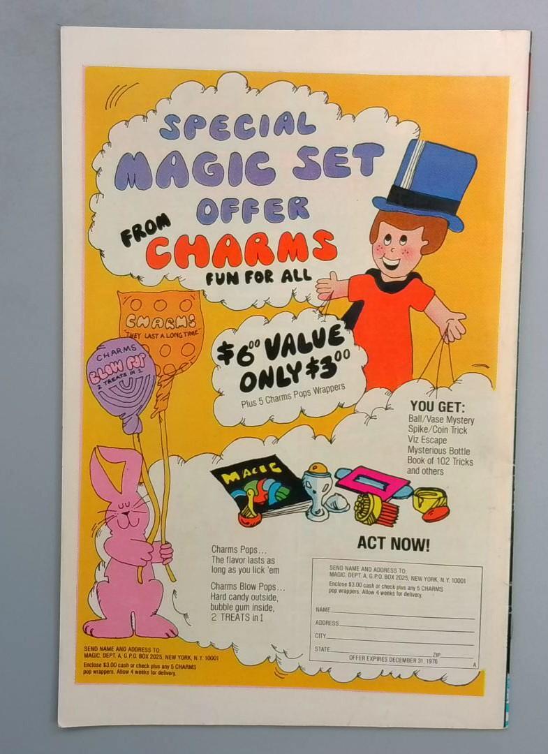 The back cover includes a vintage advertisement for a Special Magic Set Offer from Charms Fun for All, featuring classic 1970s mail-order promotional content that captures the era of comic book culture.