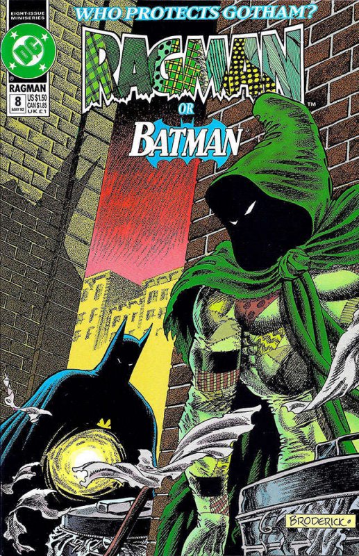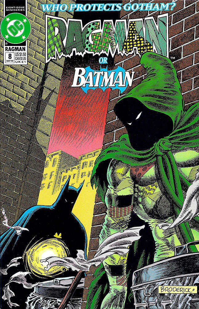 Item: Ragman (Mini-series) #8 | Publisher: DC | Cover Date: May 1992 | Writer: Keith Giffen, Robert Loren Fleming | Artist: Keith Giffen, Romeo Tanghal, Pat Broderick | Cover Artist: Pat Broderick | Appearances: Batman | Storylines: Winds of Change | Notes: Final Issue | With Economy shipping, each additional comic ships for just 50 cents more to customers in the USA. This listing contains a stock photo and information from ComicBase™ and © Human Computing. The stock photo is for reference only. If you would like to see a photo of the actual item, please message us prior to purchasing.Seller Information