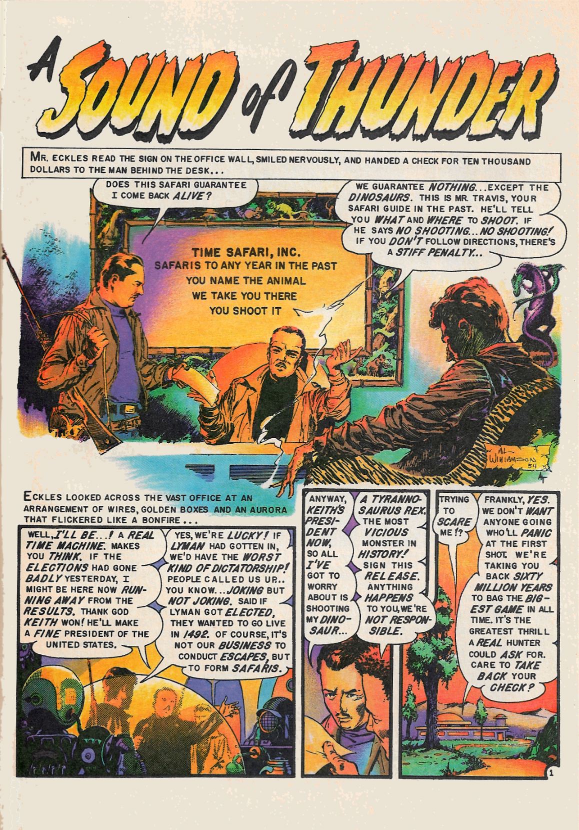 Richard Corben does his airbrush thing on "A Sound Of Thunder", the tale of a group of hunters who go back to the dinosaur era . . with drastic results! Also presented, with modern coloring, is the original Al Williamson adaptation of the same story from WEIRD SCIENCE-FANTASY #25 of 1954!