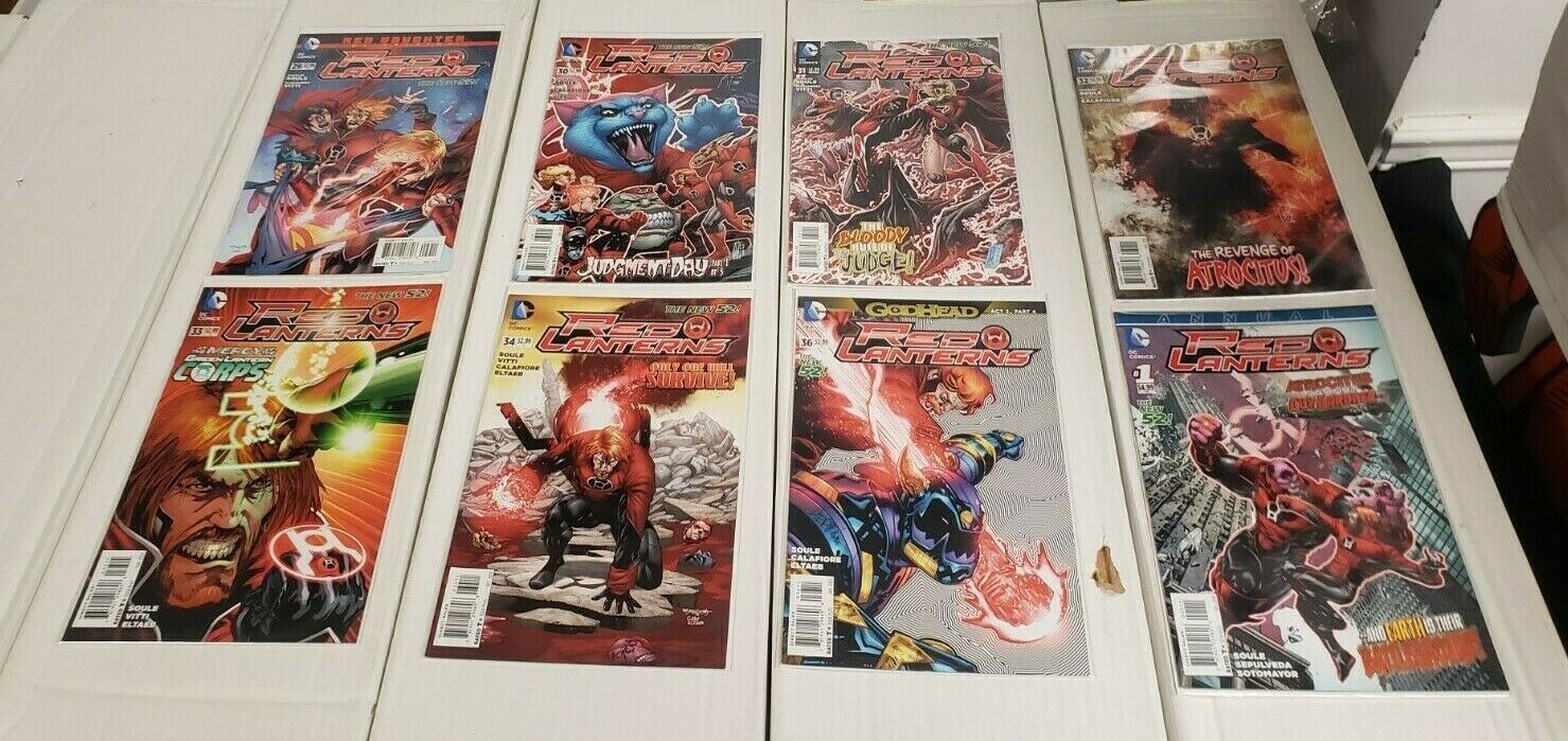 Red lantern 8pc (vf/nm) bagged & boarded, atrocitus against guy gardner 2014-15size: 7" x 10"this item was uploaded by tk.We combine shipping!!! Either wait for us to send you an invoice after you commit to buy or, if it makes you pay right away, message us back and we'll refund the excess charge. Buy as many single comic books as you want for one low flat shipping rate in the united states! International will be charged exact according to size and weight. If you have any specific questions or requests, please ask us prior to ordering and we'll get back to you as soon as we can. If there are any problems with your order whatsoever, please message us before leaving feedback and we'll be happy to work with you to fix the situation! We ship worldwide, combine purchases, and charge exact shipping. The price may vary based on size, weight, and location. If you are automatically overcharged for shipping, message us and we'll be happy to revise the invoice or refund you the excess amount. If you have any questions regarding shipping, please message us. International buyers - please note: import duties, taxes, and charges are not included in the item price or shipping cost. These charges are the buyer's responsibility. Please check with your country's customs office to determine what these additional costs will be prior to bidding or buying. Payment can be made by paypal and credit cards directly. 120,000+ items in total in my Hip store! Frequently asked questions: when are your operation hours?Our in office hours are monday - friday, 11 am - 8 pm. We are not open on weekends, so if you send us a request on friday evening we won't get back to you until monday afternoon. Please don't take it as us ignoring you! We will work on your request monday and get back to you as soon as we can. Also, if you order from us on a friday evening or saturday morning we won't start processing your order until we open on monday. That means on monday it will be pulled and prepped for shipping, then picked up by the postman on tuesday morning.When will you ship my item? The tracking hasn't moved.We realize you're eager to get your item, so if the tracking hasn't moved in a few days please don't be concerned. We give the postman a lot of packages daily, sometimes as many as 100, so he does not scan each item for us upon pickup as he says it would be too time consuming for him to do so. If you get a tracking number from us, that almost always means your item was picked up by the postman the next business day. The usps is also imperfect. There are times when the tracking won't even show movement until it's in your area's regional distribution center. This is normal in our experience. Is the item pictured the exact one for sale?Yes! We don't use stock images and go through great lengths to scan or photograph everything we list. The item pictured is exactly what you should receive unless it is a fixed price listing with multiple items available. Can you issue a coa? We can, upon request. Please make sure you leave us a note while checking out and shoot us a message immediately after requesting one, just to be sure. How do you grade?Grading is very subjective, but we are professionals with decades of grading experience between us who try the best we can to accurately describe the condition of the items we list. Anthony is an overstreet comic book price guide advisor please see the grading chart below for a breakdown of how we grade: note: we don't grade any raw books higher than 9.2, as once you go higher than that grading gets really subjective. If you buy a nm book from us, it may very well be higher than 9.2 but we play it safe and grade conservatively. 9.2 nm near mint 9.0 vf/nm very fine/near mint 8.5 vf+ very fine+ 8.0 vf very fine 7.5 vf- very fine- 7.0 fn/vf fine/very fine 6.5 fn+ fine+ 6.0 fn fine 5.5 fn- fine- 5.0 vg/fn very good/fine 4.5 vg+ very good+ 4.0 vg very good 3.5 vg- very good- 3.0 gd/vg good/very good 2.5 gd+ good+ 2.0 gd good 1.8 gd- good- 1.5 fr/gd fair/good 1.0 fr fair 0.5 pr poorhow do you ship comics? We ship in rigid cardboard mailers to protect your comic book from the worst the mail system has to offer. Price varies based on the number of books you purchase, but we try to keep costs as low as we can and charge exact shipping. If it looks unusually high to you please send us a message and we'll be happy to double check for you. Do you combine shipping? Yes, of like items. Such as: several comics can fit in one cardboard mailer, as can more than one record. Multiple art pages can easily be combined because they are light and thin. Where combined shipping differs is with size and weight. For instance, two statues require a much bigger box. Same goes for cgcs, as the package gets bigger and heavier as you go. Do you ship well? I've had some bad experiences... You needn't worry; we are professionals who value your business and want your item to arrive safely as much as you do. I have been collecting for over 30 years. I send out items the way i would like to receive them. The tracking says my item is "out for delivery" in new jersey. Why is that?If the tracking indicates that the item is "out for delivery" in nj don't worry, it's just what the tracking says when it's carried over from the postman to the sorting center. This is normal for our post office and will not impact you receiving your item in a timely matter.What is the difference between a run and a lot?Good question. A run will be a collection of consecutive issues with no breaks in between them. If it says run of #s 1 - 50 you will receive 50 consecutive comics. A lot will be within a certain range, so a 50pc lot will not contain consecutive books.I changed my mind after successfully winning the auction or fixed price listing, will you cancel the transaction? Please only bid or hit buy it now if you are willing to follow through and pay for the item, we will not cancel the transaction. As a seller, Hip penalizes us every time we cancel a