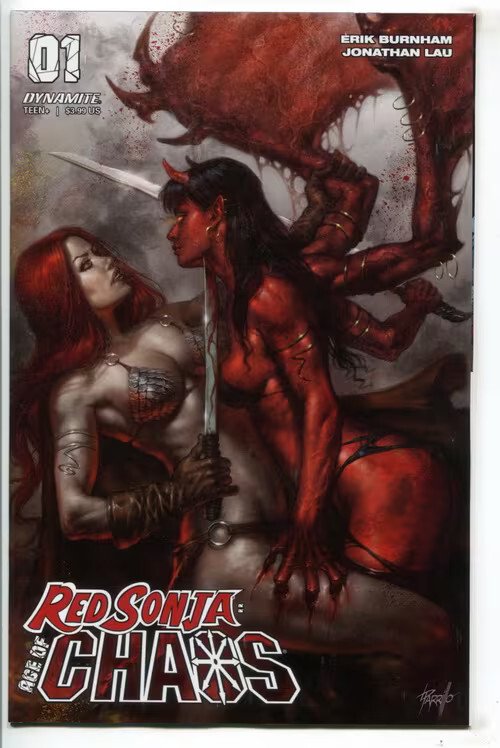 Grade: 9.2 Near Mint-Red sonja age of chaos (2019 dynamite) #1 cvr a parrillo item number: rzya-bmb8vl the past meets the present with the future of literally everything at stake! The warrior red sonja has a plan to keep freshly killed wizard kulan gath from resurrecting himself again - but when the plan backfires, it allows a whole new kind of chaos! To infest the hyborean age! Will these new beings be any easier to deal with than kulan gath, or has sonja called a worse evil to her world? It's the first chapter of a brand-new quest for the she-devil - and it may be her hardest yet as for the first time ever, red sonja meets the badass characters of chaos!