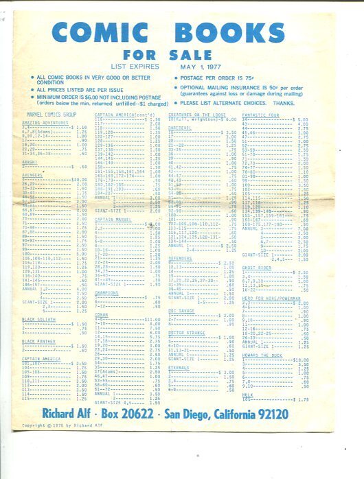 Grade: VGRichard alf comic book price list -1977-6.5 x 8.5 - richard, as a teen-ager was one of the founders of the original san diego comic book convention in 1970. This famous event took place at the u s grant hotel and was attended by about 150 fans, many of whom are now prominent in the comic book field. Richard was able to finance the original event with proceeds from his comic book mail order business. Richard passed away in early 2012 and we are proud to offer his 4 page mail order price list from 1977, featuring back issue marvel and dc comics. Important piece of early comic book history size is about 6.5" x 8.5" grade: vg sku: do-37-140