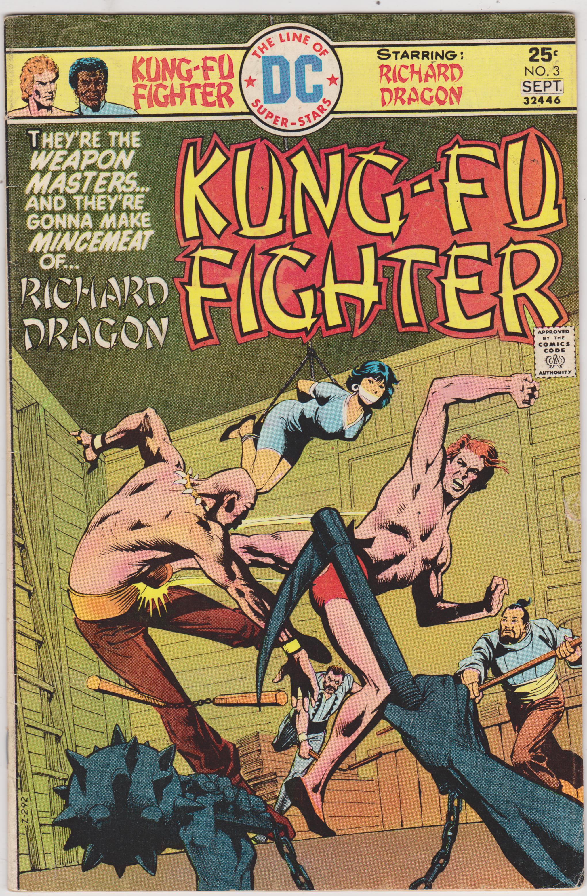 Richard Dragon Kung-Fu Fighter #3 by DC Comics copyright 1973. I have graded the comic book, using the Overstreet Grading Guide, at FINE with the following defects: Light stress marks along the spine. The corners are rounded. There are soiling through out the cover. There is a tear in the right edge. There is yellowing of the pages.Seller Information