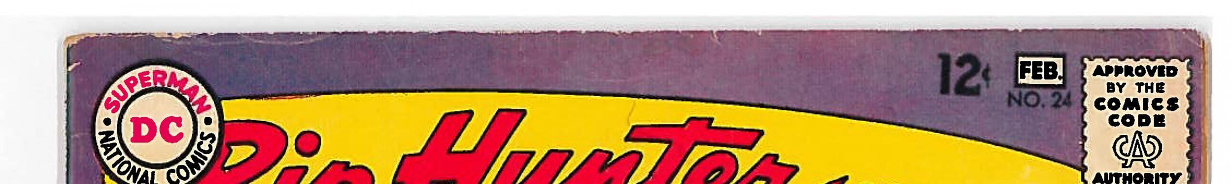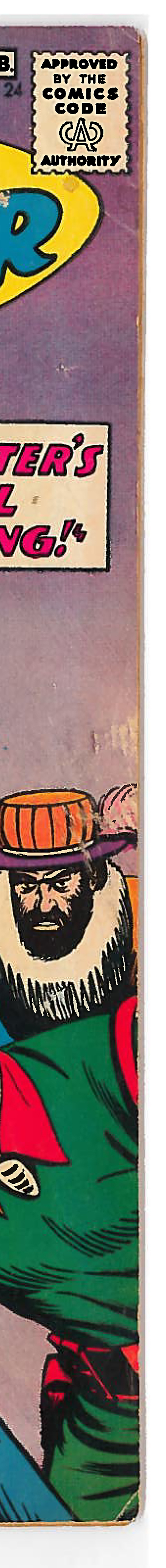 Rip Hunter Time Master (1961) #24 FN-. Professionally graded. Pages are off-white with light tanning at the edges, supple and in excellent condition, centerfold firmly attached. Front cover: Spine wear, tiny dings at top and bottom of spine, finger bends along top edge, small holes and minor damage to cover above “E” in MASTER with minor depressions that extend into the first two pages, corner creases, finger bends and scratches on right edge, small nick in bottom edge, small hole with scratching in extended right arm at cuff. Back cover: very small chips and tears along top and bottom edges (see scans).Scans are of the actual item.