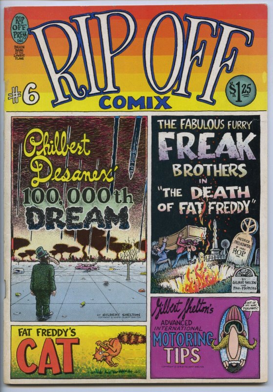 RIP OFF COMIX #6 - 5.5, OW-W - 1st printing - Freak BrothersDESCRIPTION:This very attractive, unrestored copy is complete, fully readable and has both covers attached. The book has very high cover gloss, a tight spine and off white to white pages. Freak Brothers and Wonder Wart-Hog stories. The book is sent in a mylar sleeve with backing board. Condition is a very conservatively graded 5.5, FN-. *You must be 18 years of age or older to bid on this auction*SHIPPING INFORMATION:Combine our auctions and $ave on shipping!Please remember that Media Rate may take up to 4 weeks delivery.FEDEX services available.Nevada residents, please add sales tax.We accept PayPal, MasterCard, Visa, Discover, American Express.NOTES AND FINE PRINT: Welcome to Redbeard's Book Den! For most that have collected comic books for the last 30 years, you have probably heard of us. Redbeard's founder and current owner is Ron Pussell (aka Redbeard), senior Overstreet Price Guide consultant since 1980.REDBEARD'S BOOK DENPO Box 217Crystal Bay, NV 89402-0217 _gsrx_vers_1503 (GS 9.2.1 (1503))