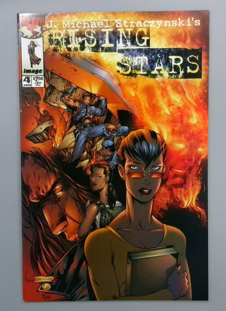 Rising Stars #4 from Image Comics, written by J. Michael Straczynski, features a dynamic and fiery cover showcasing multiple characters in an intense, action-packed scene. The series follows a group of special individuals known as the "Specials" - people born with unique abilities after a mysterious event. This issue appears to highlight the complex relationships and conflicts within this group of extraordinary characters, with a strong focus on their powers and interpersonal dynamics.
