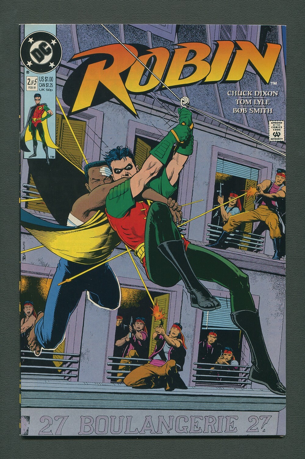 First printing. Tim Drake heads to Paris to study under the Tibetan Rahul Lama, then finds himself in a brawl with the Ghost Dragons gang in "Big Bad World." Script by Chuck Dixon, art by Tom Lyle and Bob Smith. Includes a poster of Robin by Neal Adams. Cover by Brian Bolland.(A)